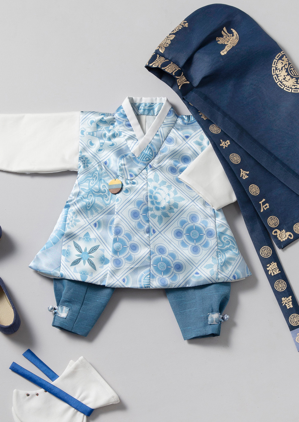 단하의 시그니처 패턴인 봉황문인문보 실크로 지은 아기한복입니다.