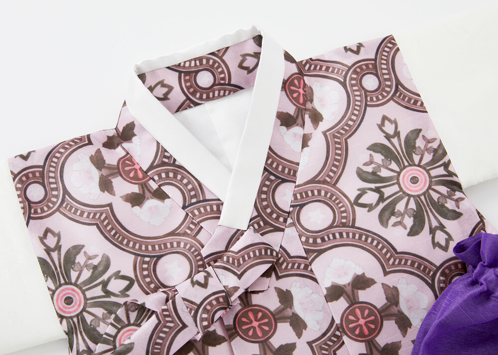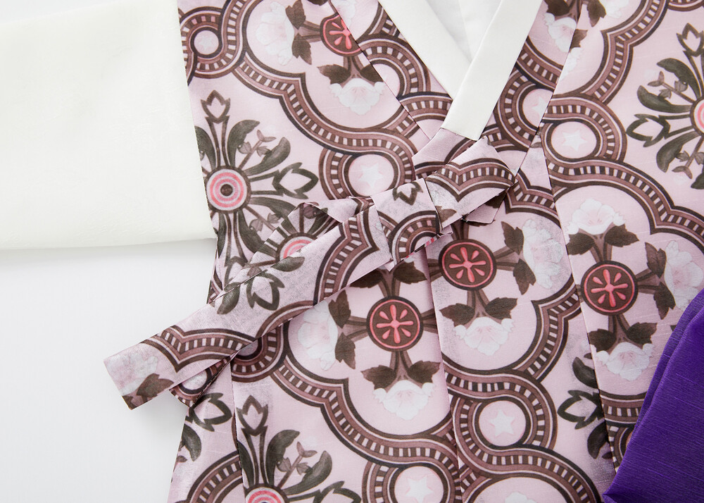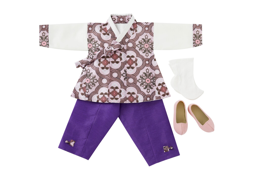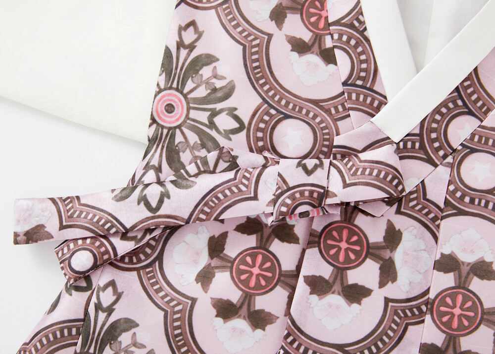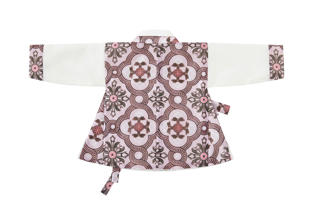 장수와 성서로움을 뜻한 국화문으로 언제나 건강하게 자라길 바라며 제작된 한복입니다.