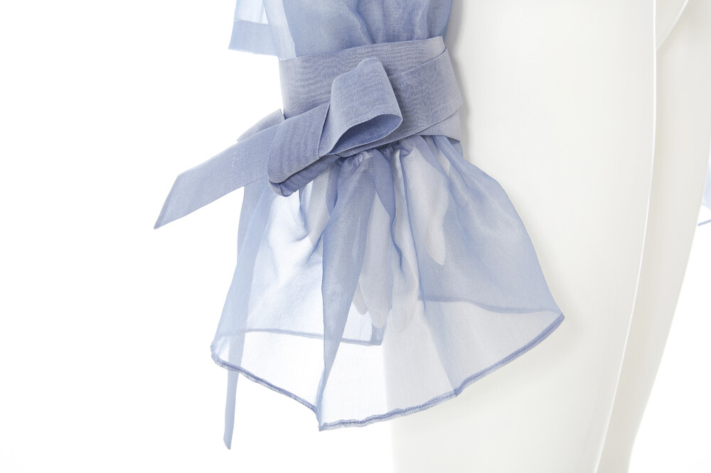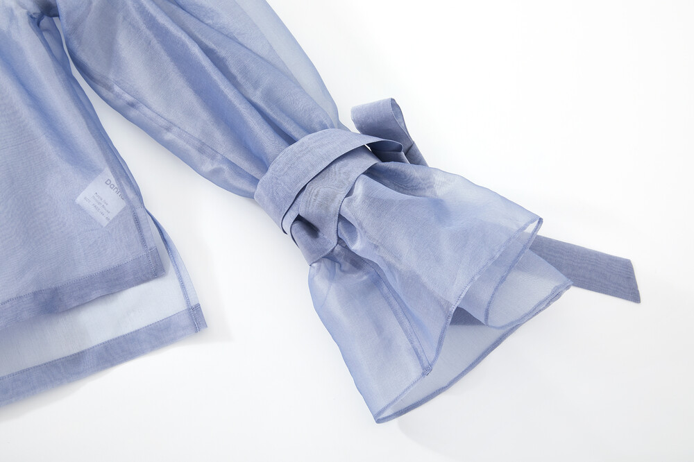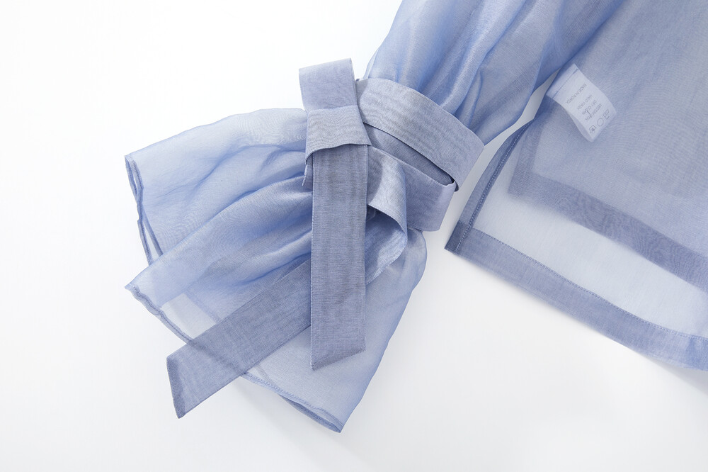 소매의 리본 디테일은 부드러운 곡선미를 강조하며, 전체적인 디자인에 우아한 포인트를 더해줍니다.