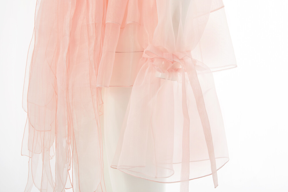 뒤로 돌았을 때 시스루 원단과 우아한 트임 디자인은 섹시하면서도 세련된 반전 매력을 연출합니다.