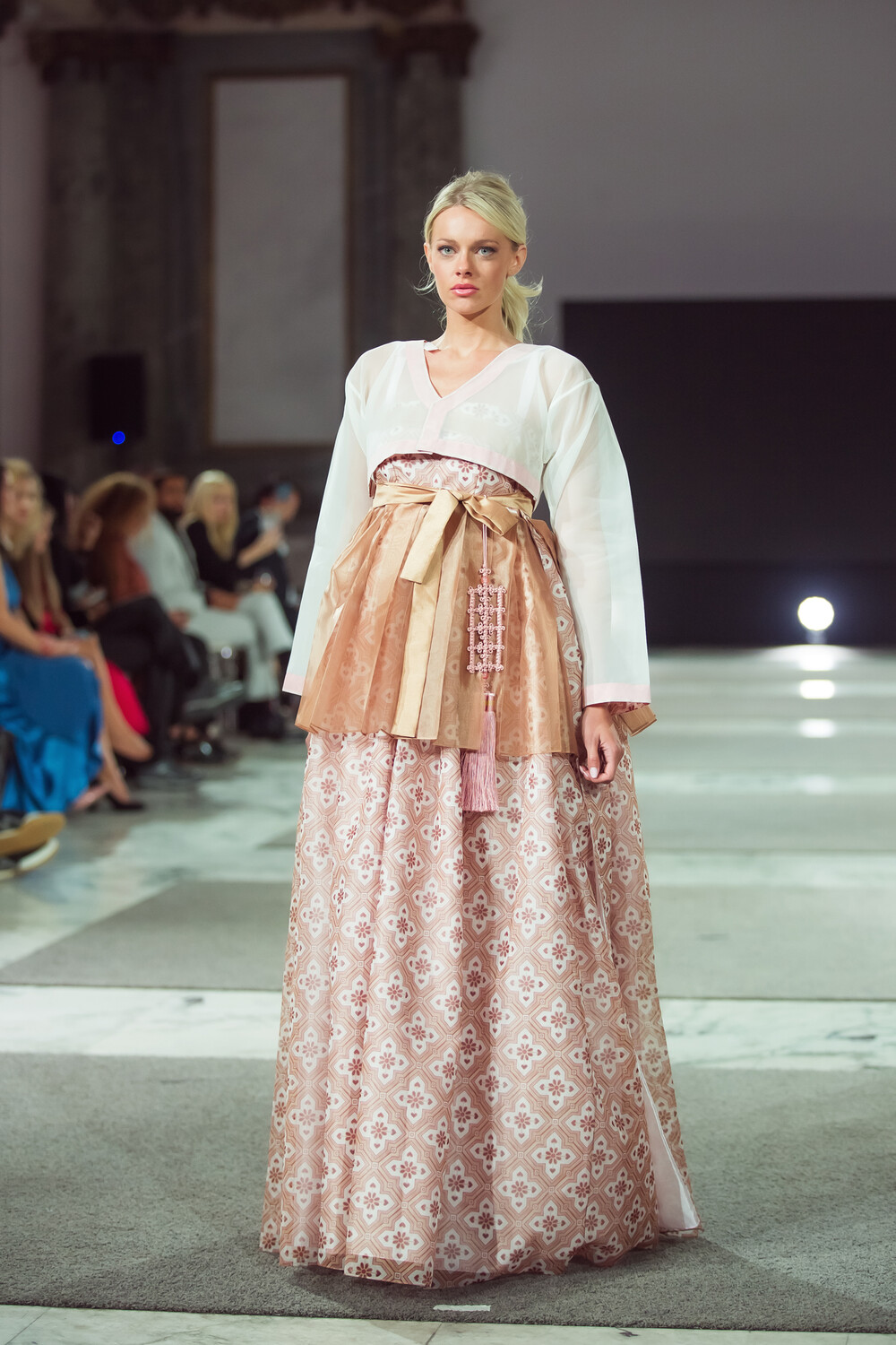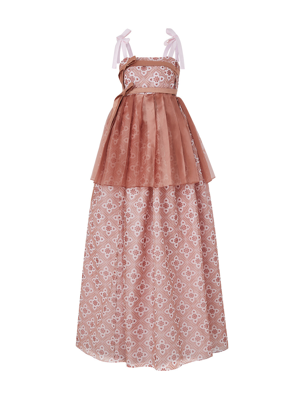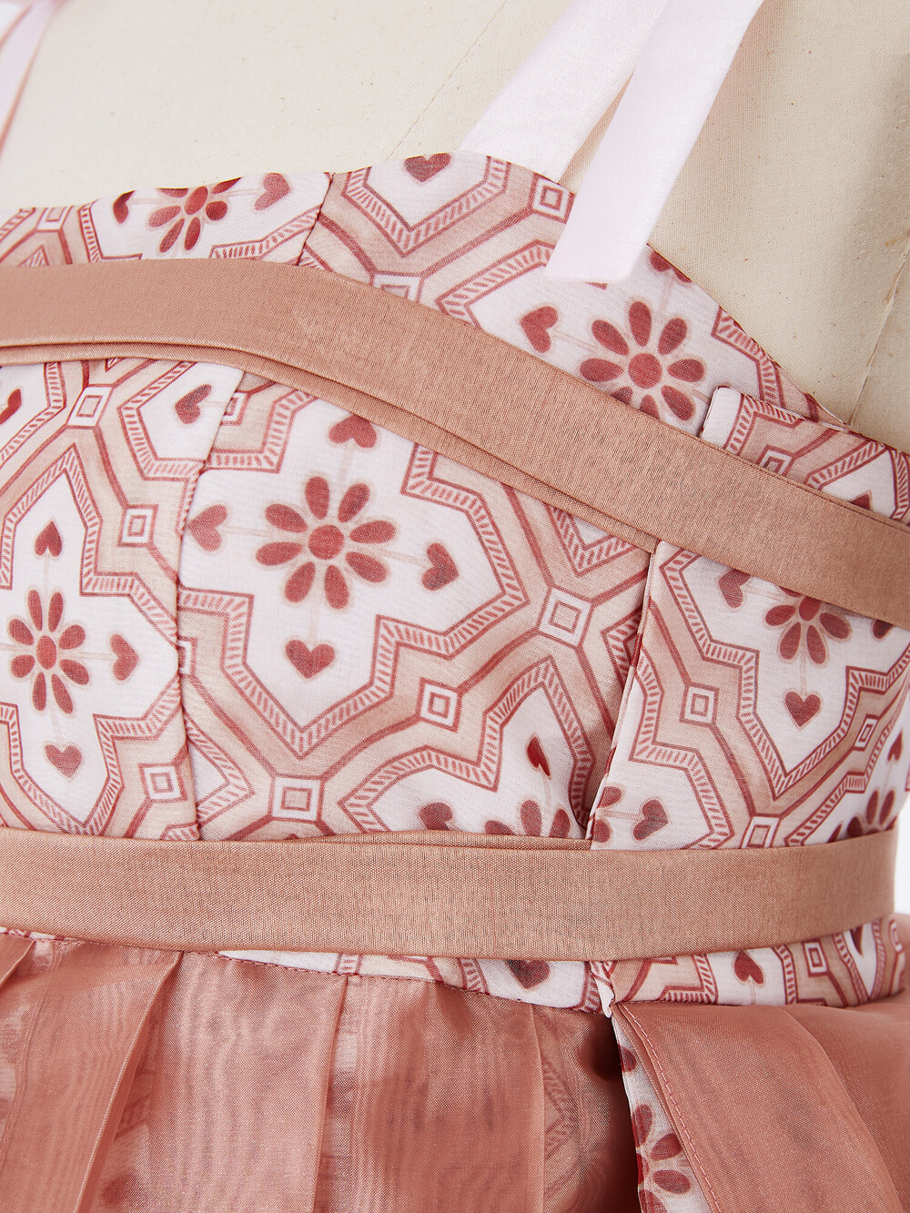 홍국화 백분문 드레스는 조선 궁중 도배지 문양 중 하나인 홍국화 백분문 패턴이 들어간 분홍빛 드레스입니다.