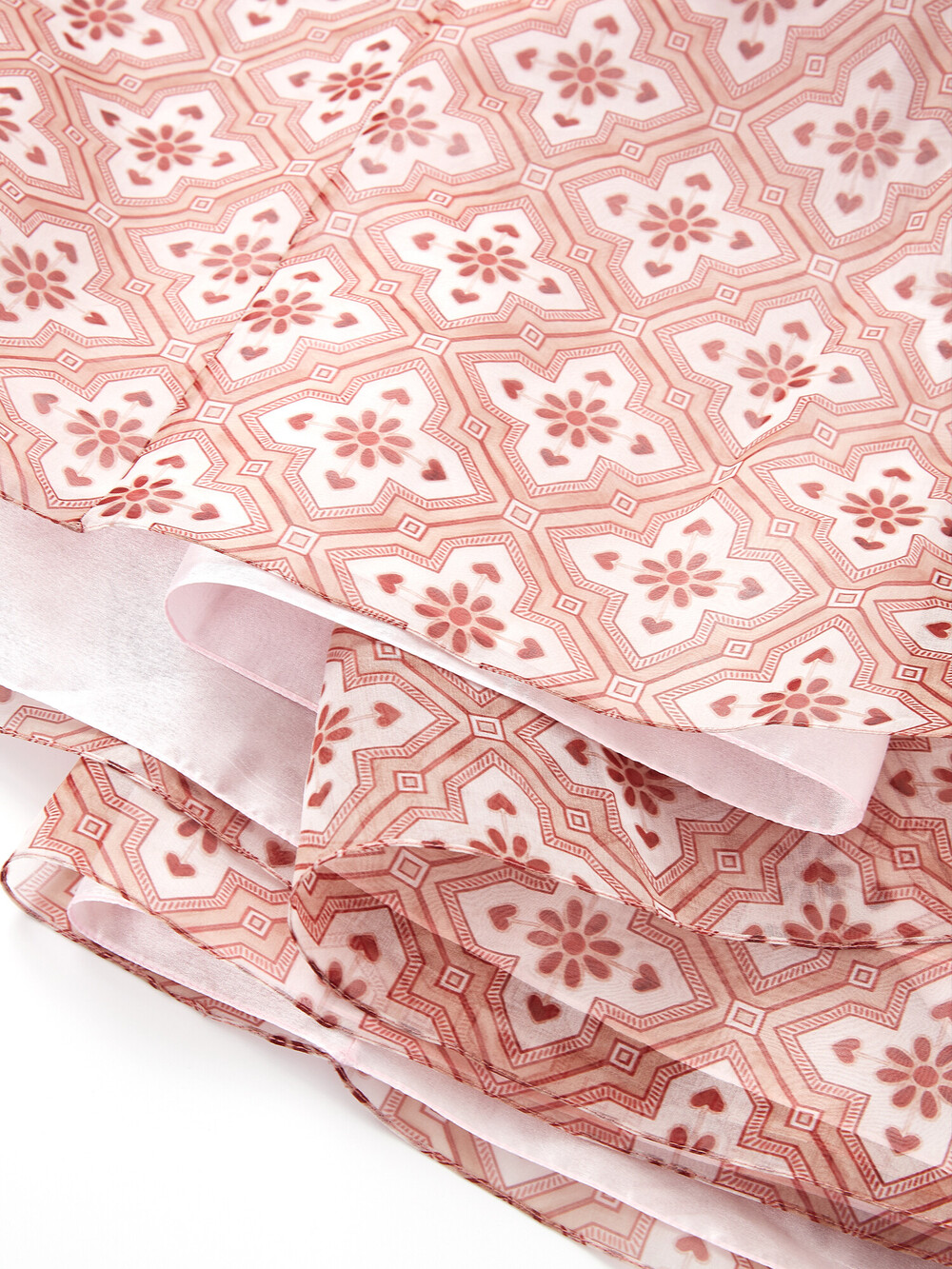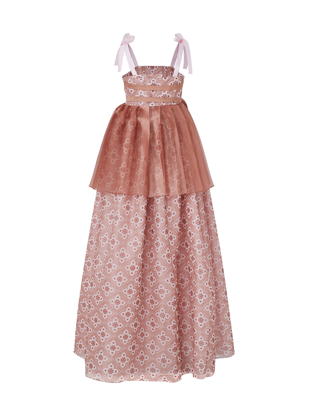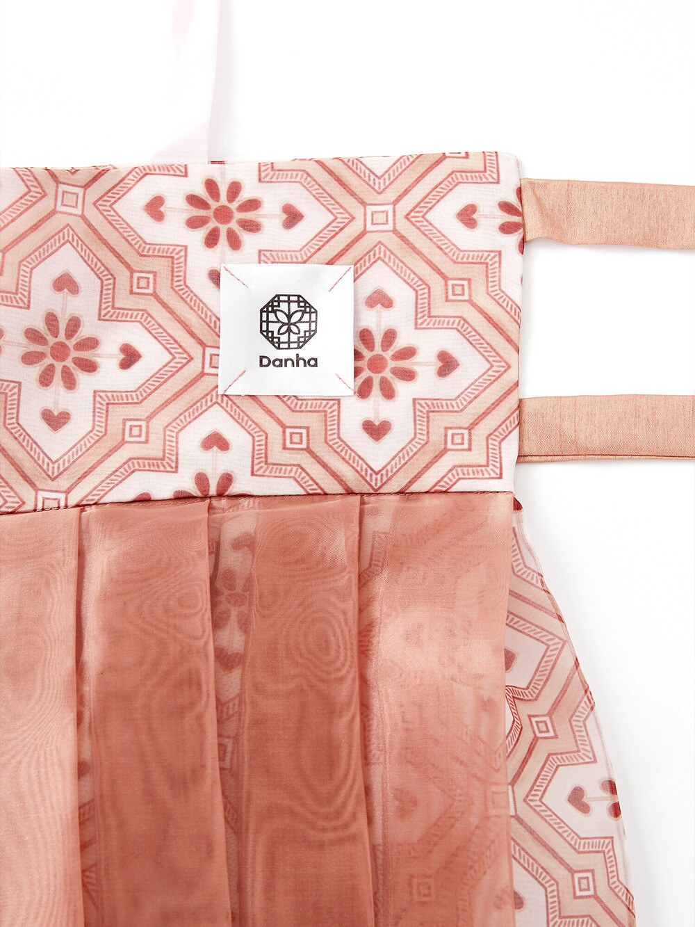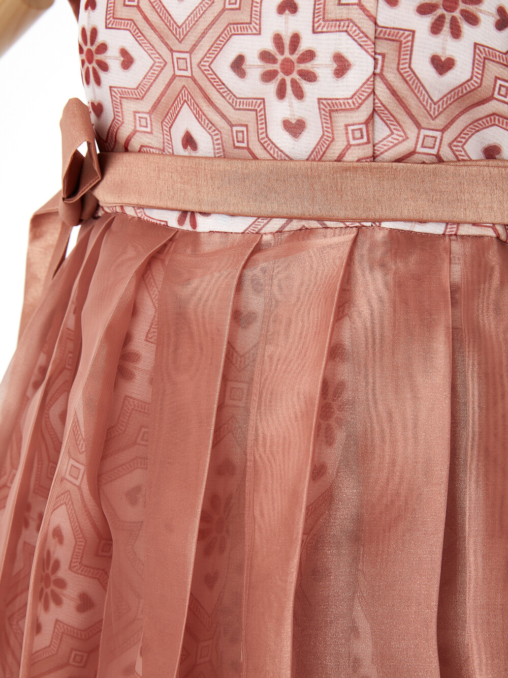홍국화 백분문 드레스는 조선 궁중 도배지 문양 중 하나인 홍국화 백분문 패턴이 들어간 분홍빛 드레스입니다.
