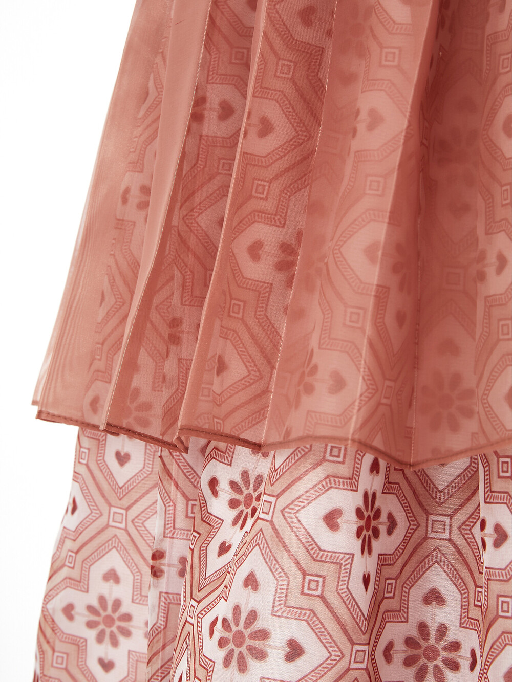 짧은 살구색 플리츠 덧치마가 더해진 디자인에 묶어 입는 어깨 끈으로 우아하면서 발랄한 분위기를 줍니다.