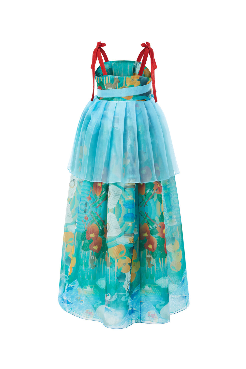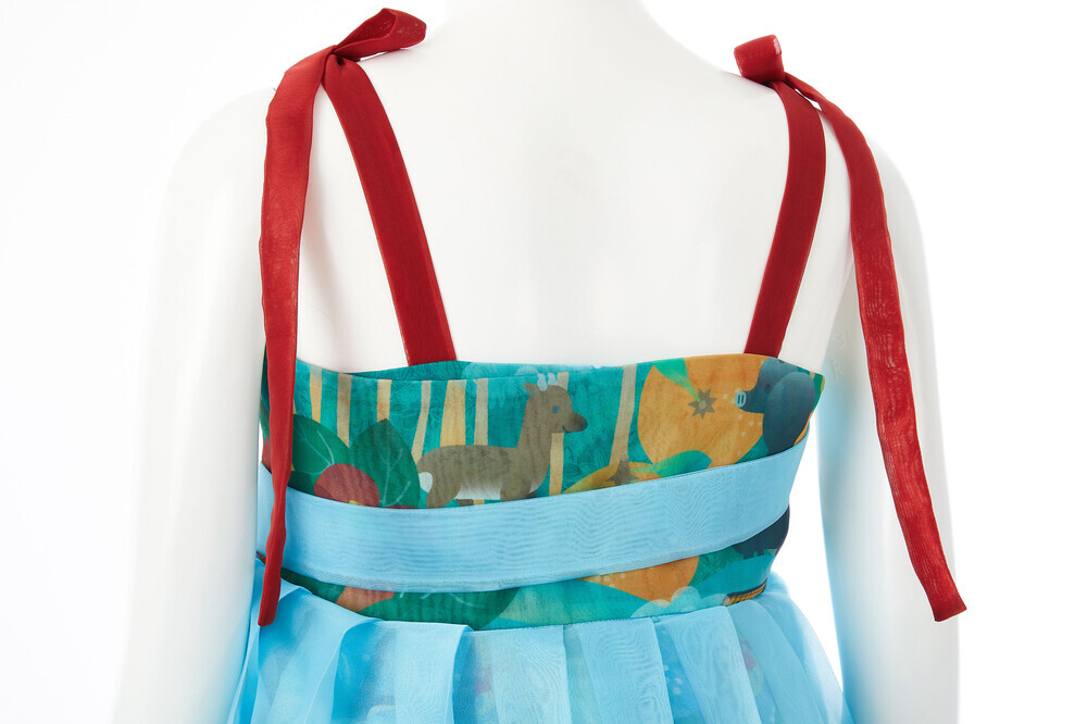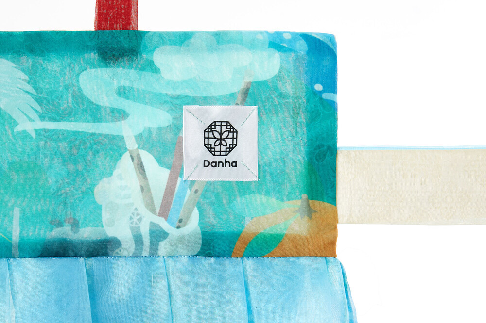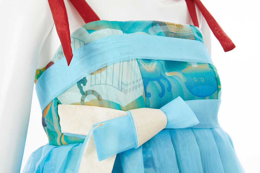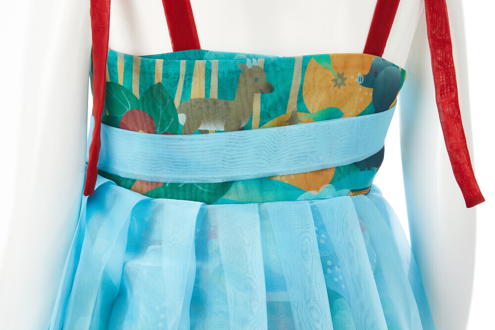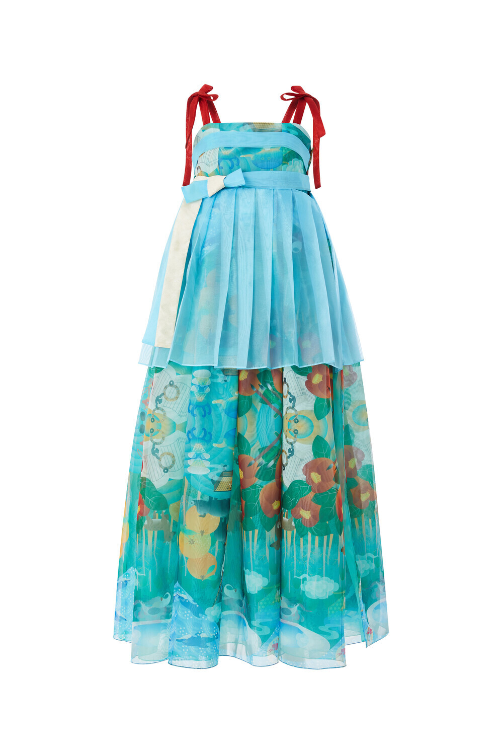 동백꽃 컬러와 같은 레드 어깨끈이 포인트가 되고 하늘색 플리츠 덧치마로 귀여운 느낌을 줍니다.
