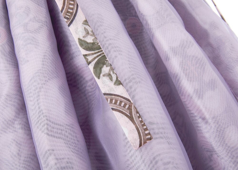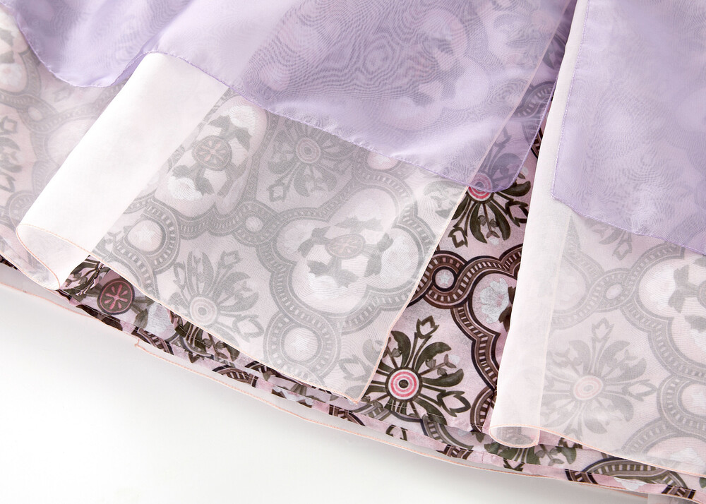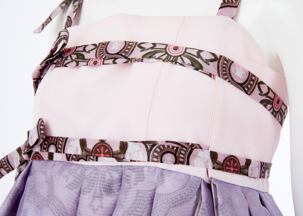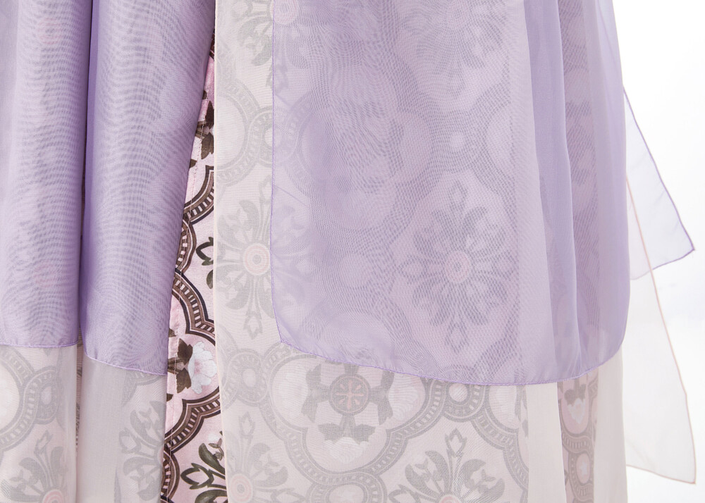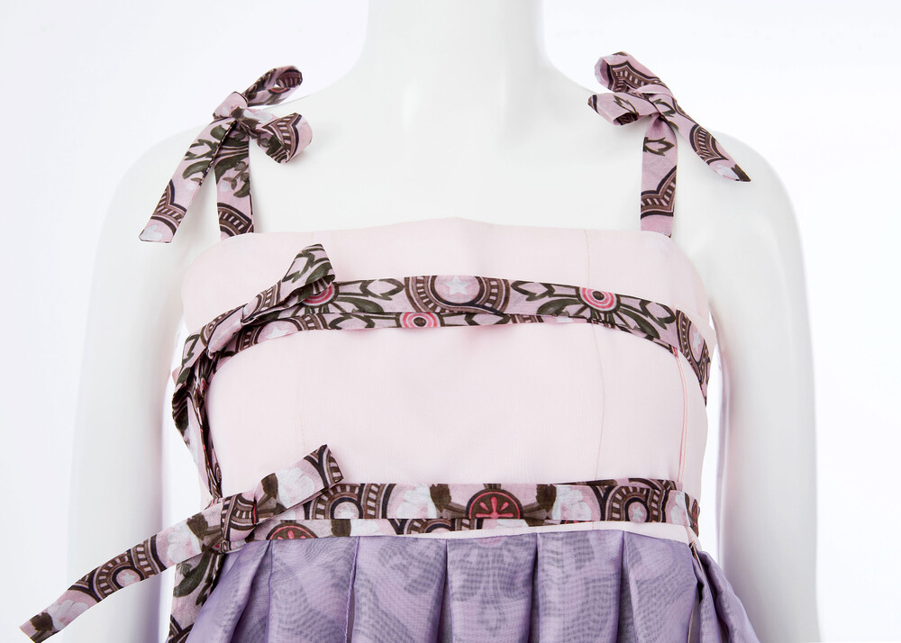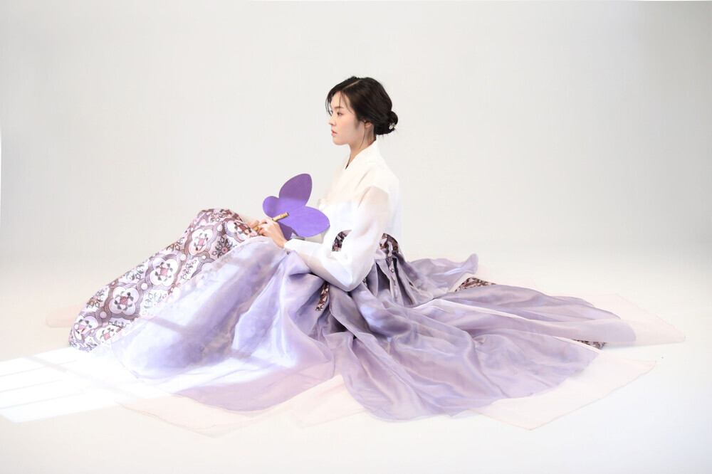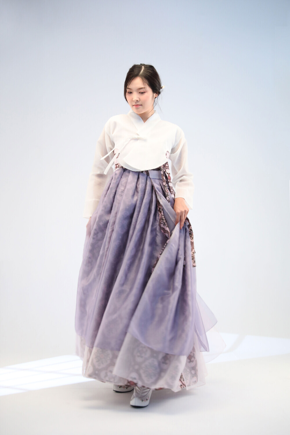 연보라 국화드레스는 조선의 궁중도배지 문양 중 하나인 국화문 패턴이 들어간 연보라 드레스 입니다.