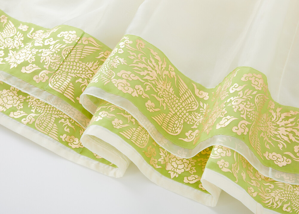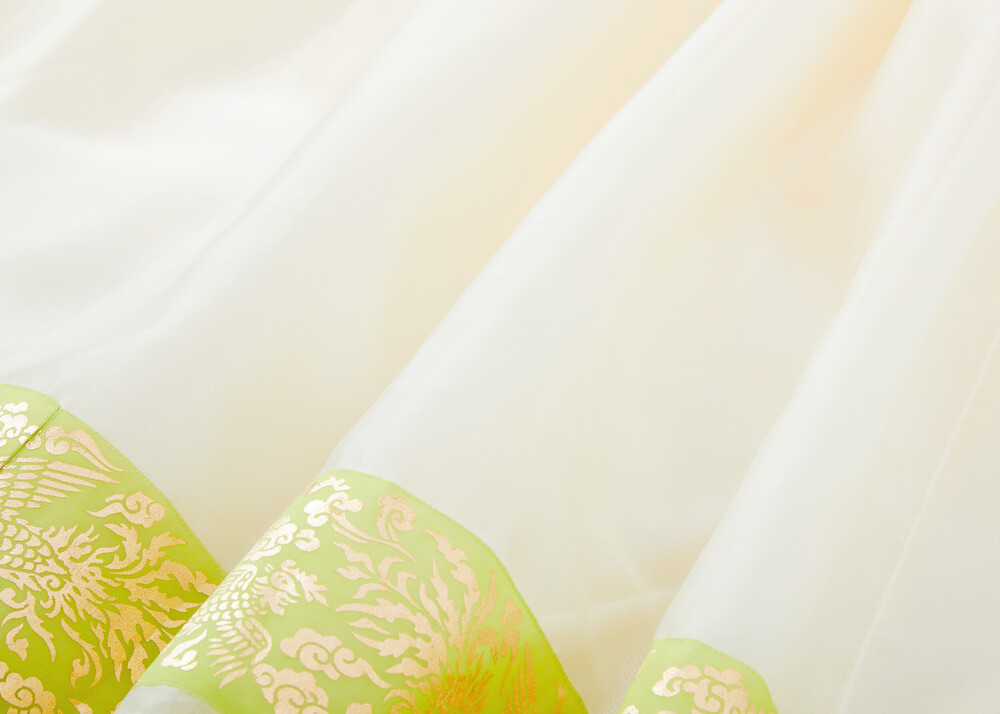 치맛단 금박 문양들은 모두 장수, 부귀, 평안, 자손번창 등을 비는 길상적인 뜻을 담고 있습니다.
