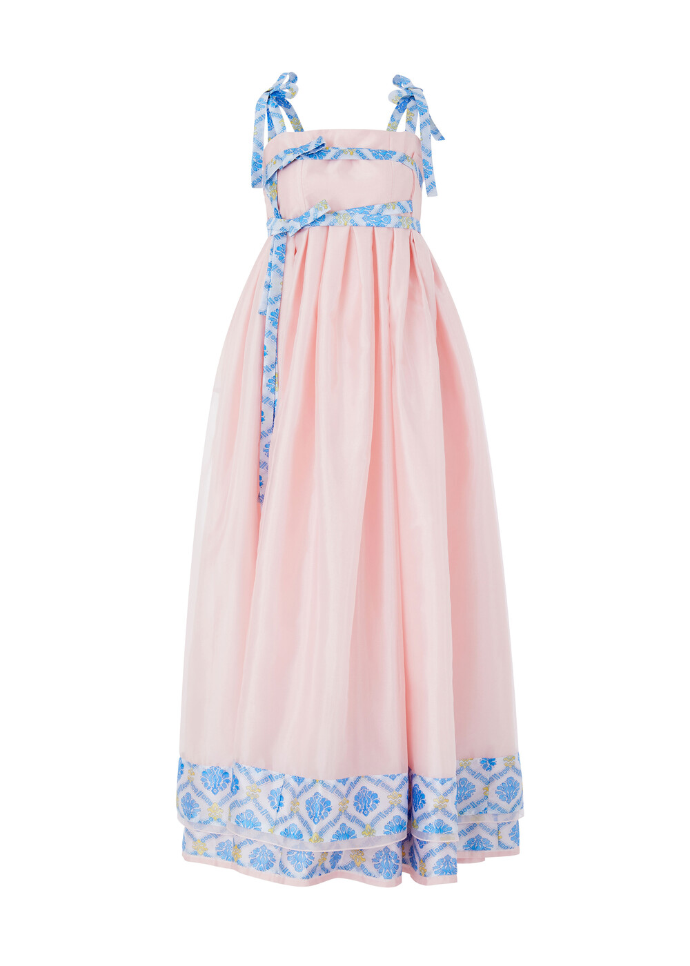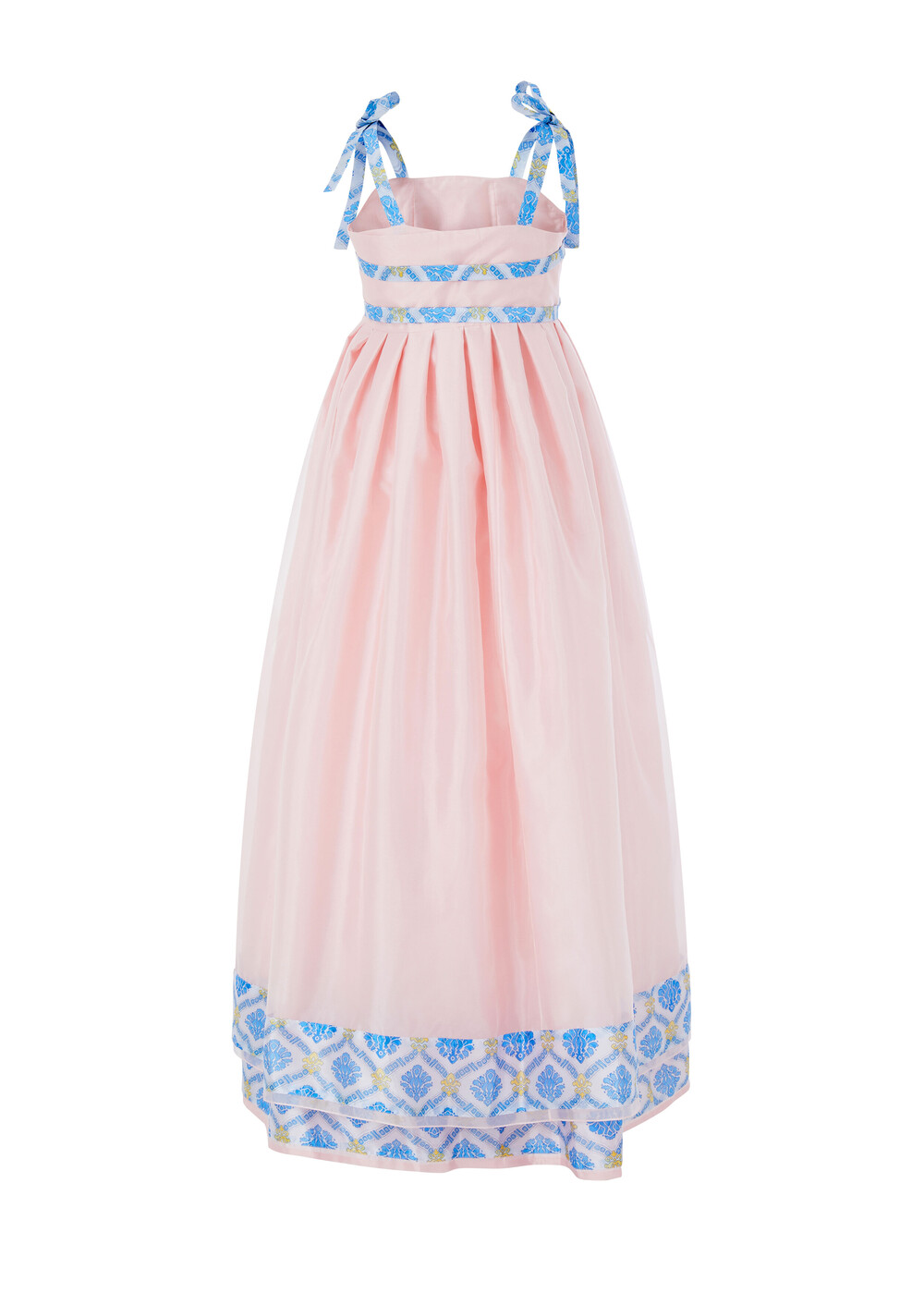 조선의 궁중도배지 문양 중 하나인 격자 패턴이 들어간 연분홍색의 드레스 입니다.