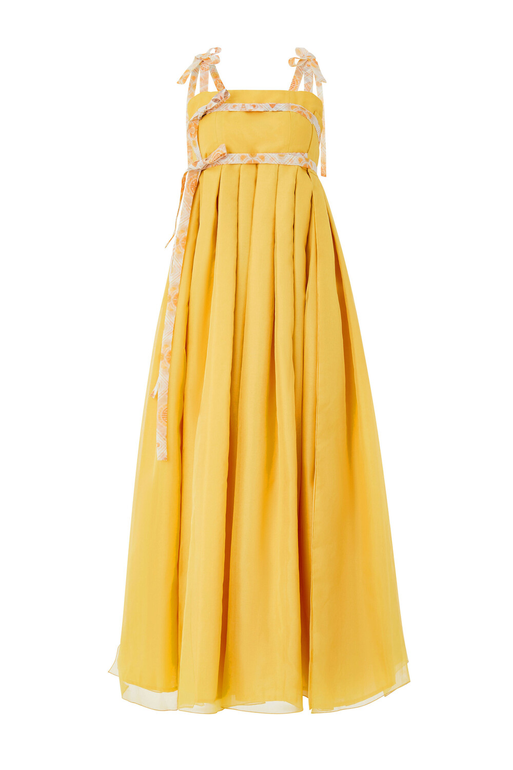 노랑 봉황문 리본 드레스는 조선의 궁중보자기 문양인 봉황문 인문보 패턴이