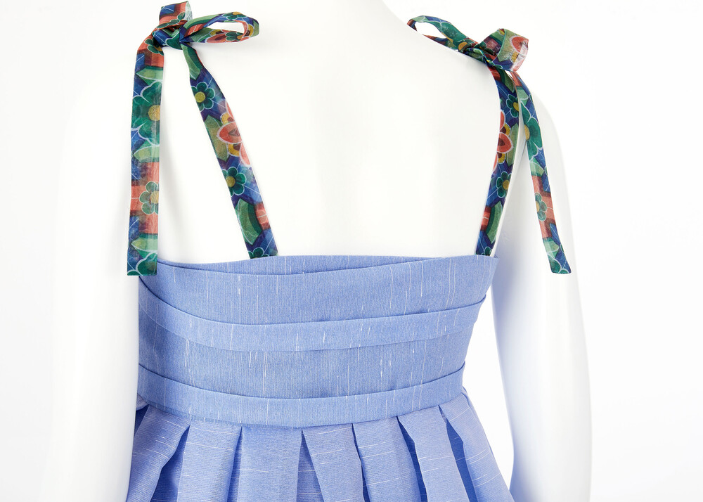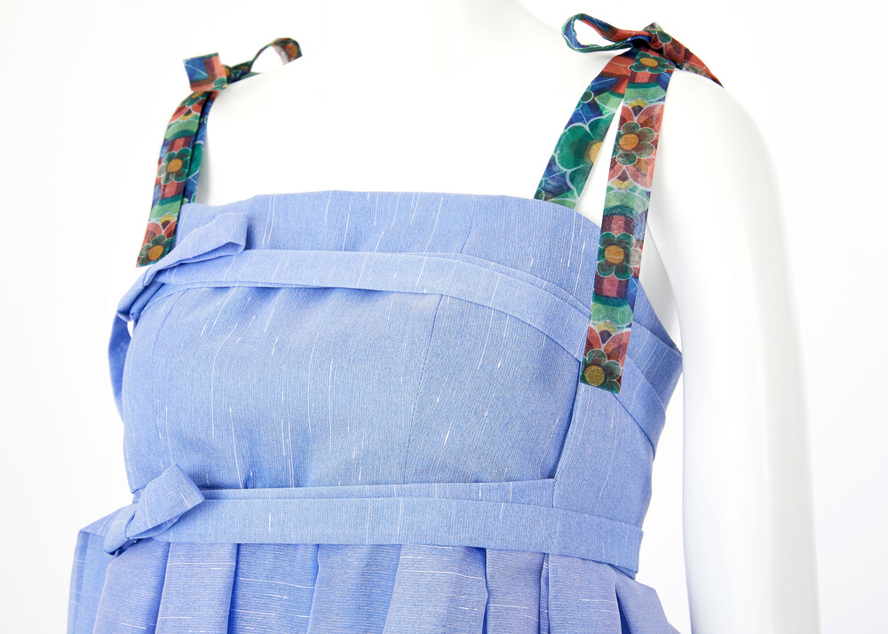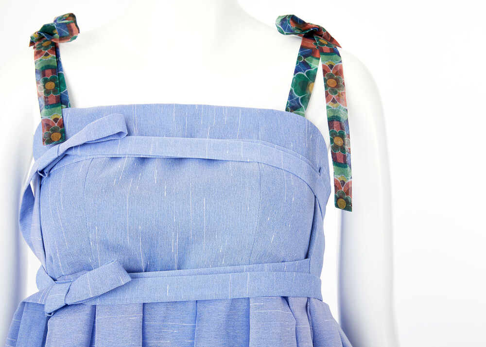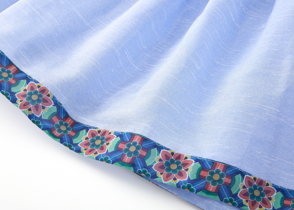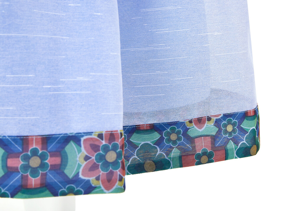 시원한 색상의 원단과 함께 어깨끈과 아랫단에 창살문 대청문양 포인트로 고급스러움을 더했습니다.
