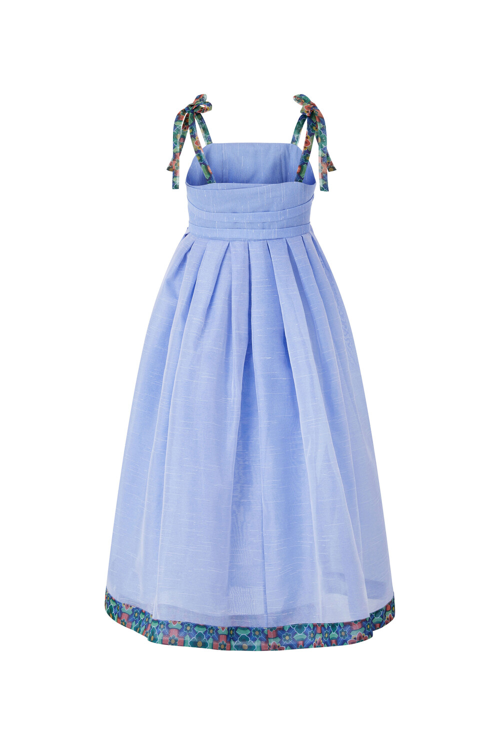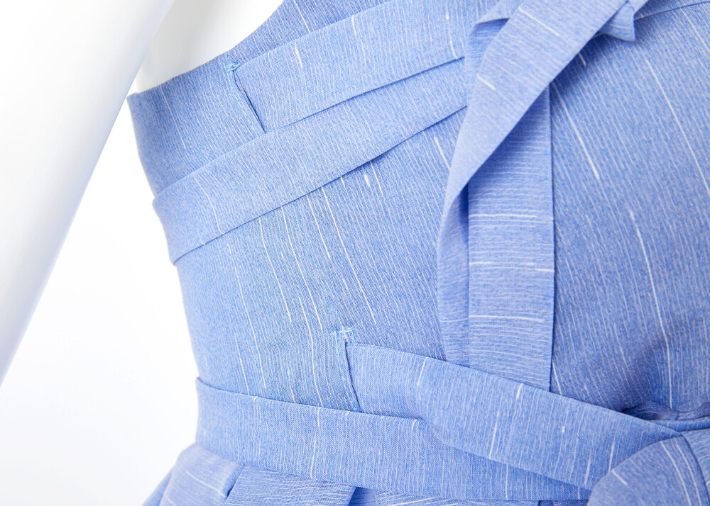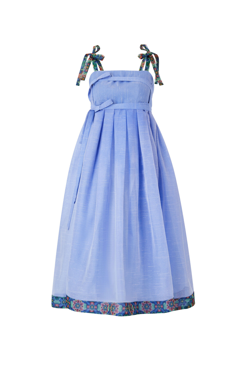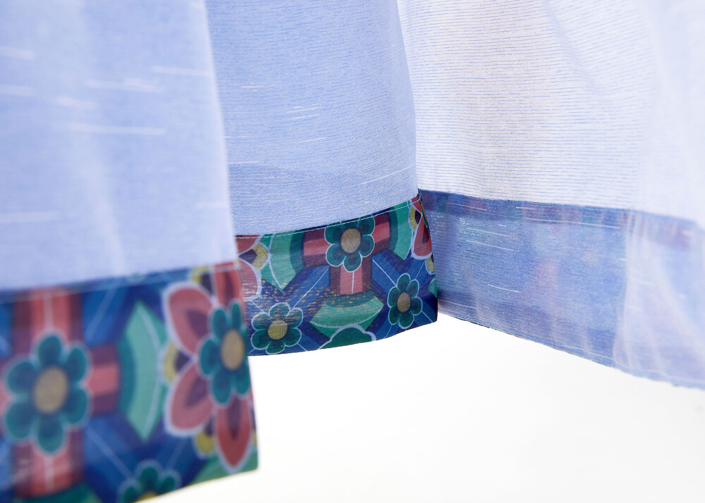 시원한 색상의 원단과 함께 어깨끈과 아랫단에 창살문 대청문양 포인트로 고급스러움을 더했습니다.