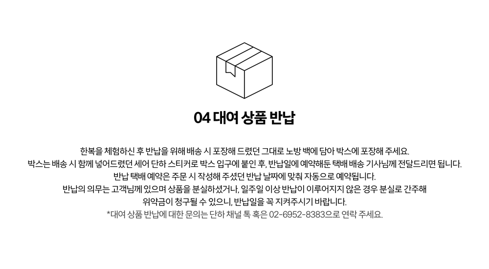 지정하신 날짜로 반납이 불가한 경우 단하 채널톡 혹은 02-6952-8383 으로 미리 연락부탁드립니다.