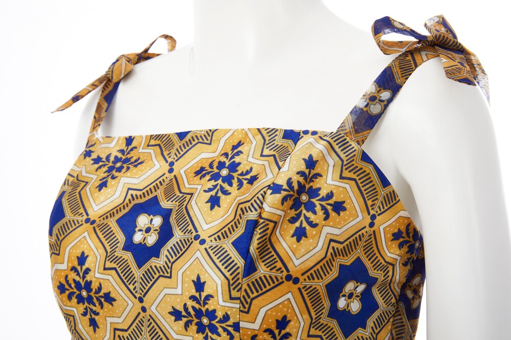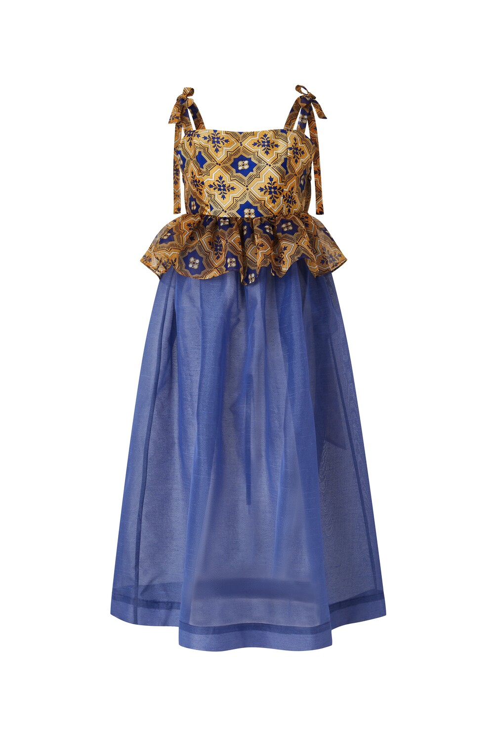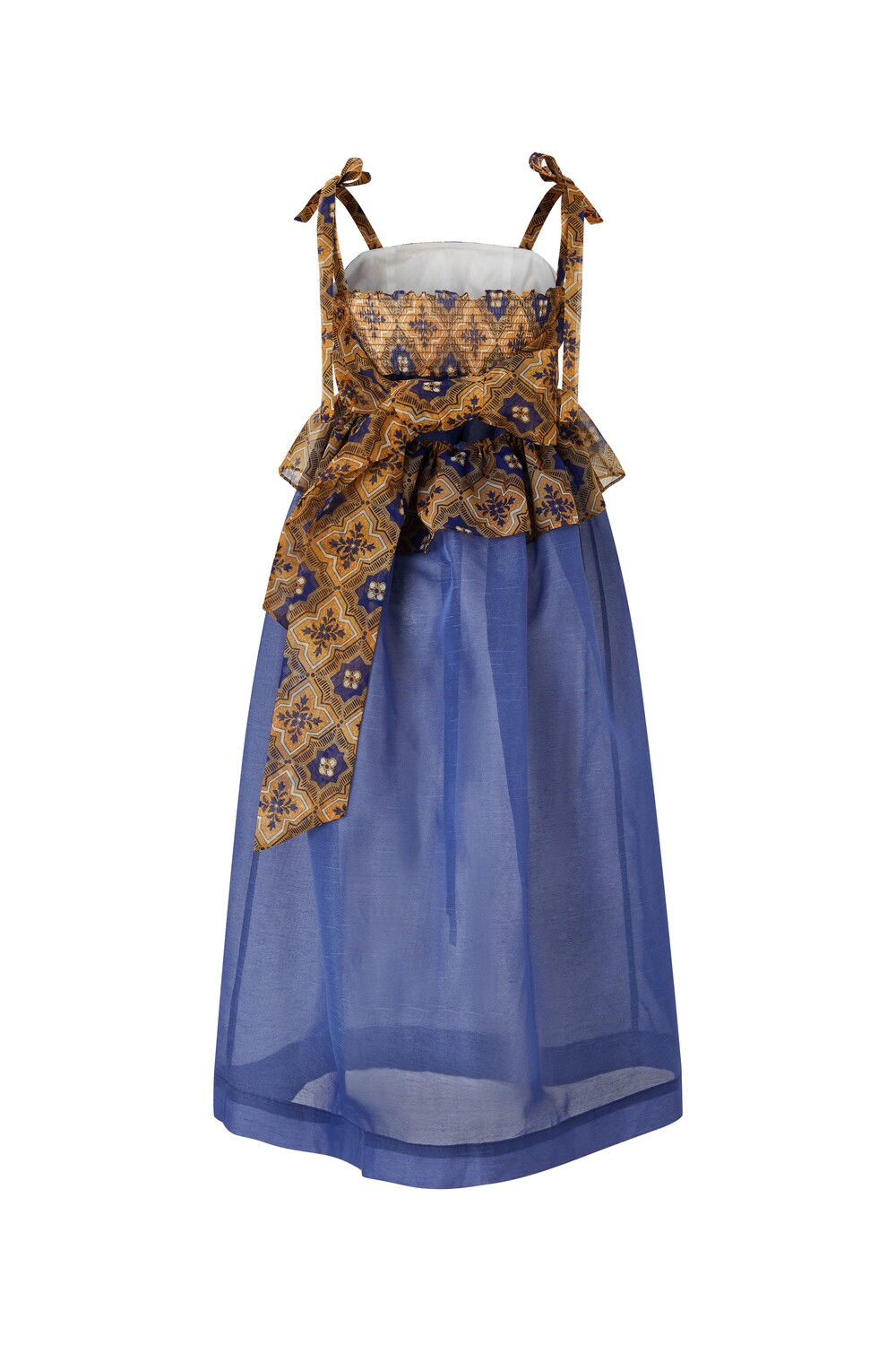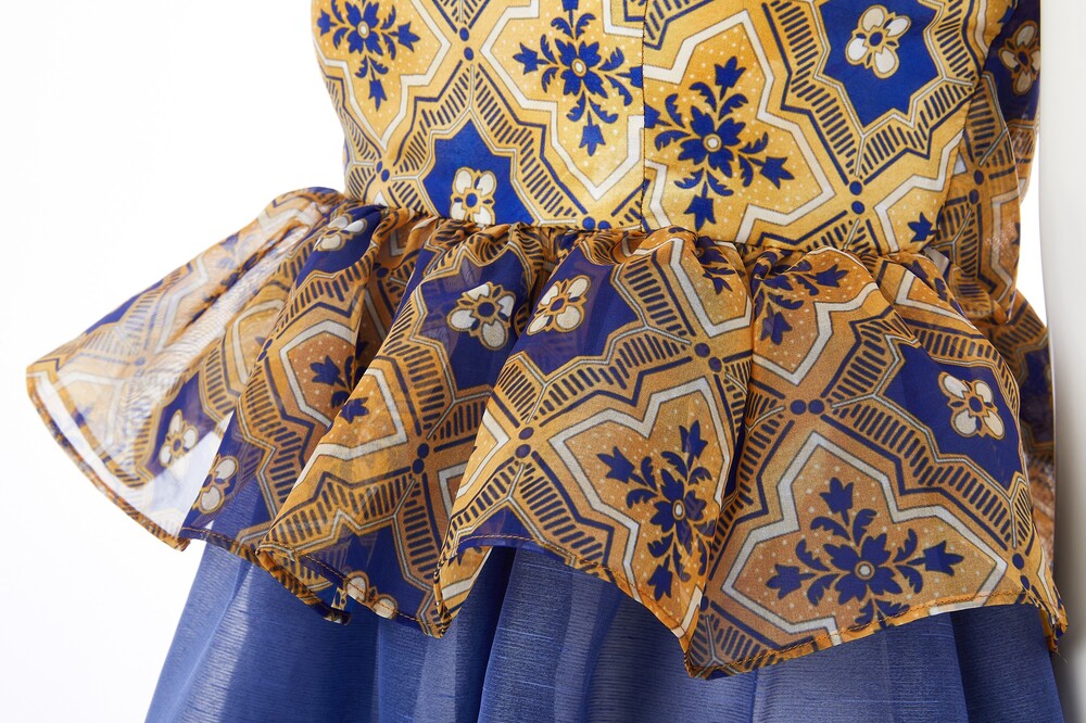 궁중 도배지 문양 비취문과 로열블루 패턴에 대슘치마가 함께 디자인된 뒷리본 드레스입니다.