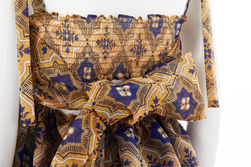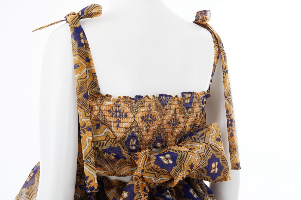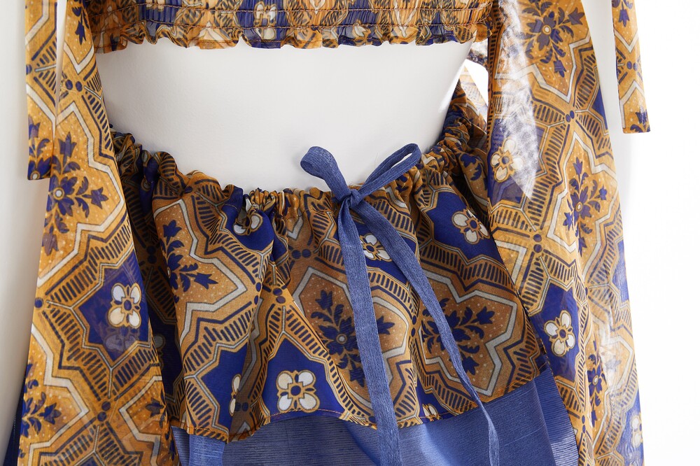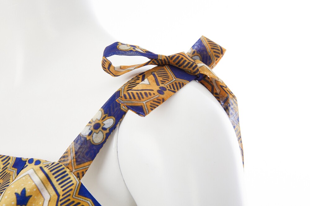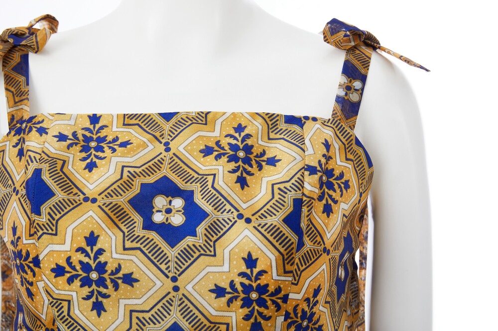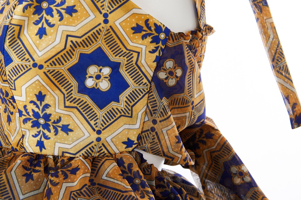 궁중 도배지 문양 비취문과 로열블루 패턴에 대슘치마가 함께 디자인된 뒷리본 드레스입니다.