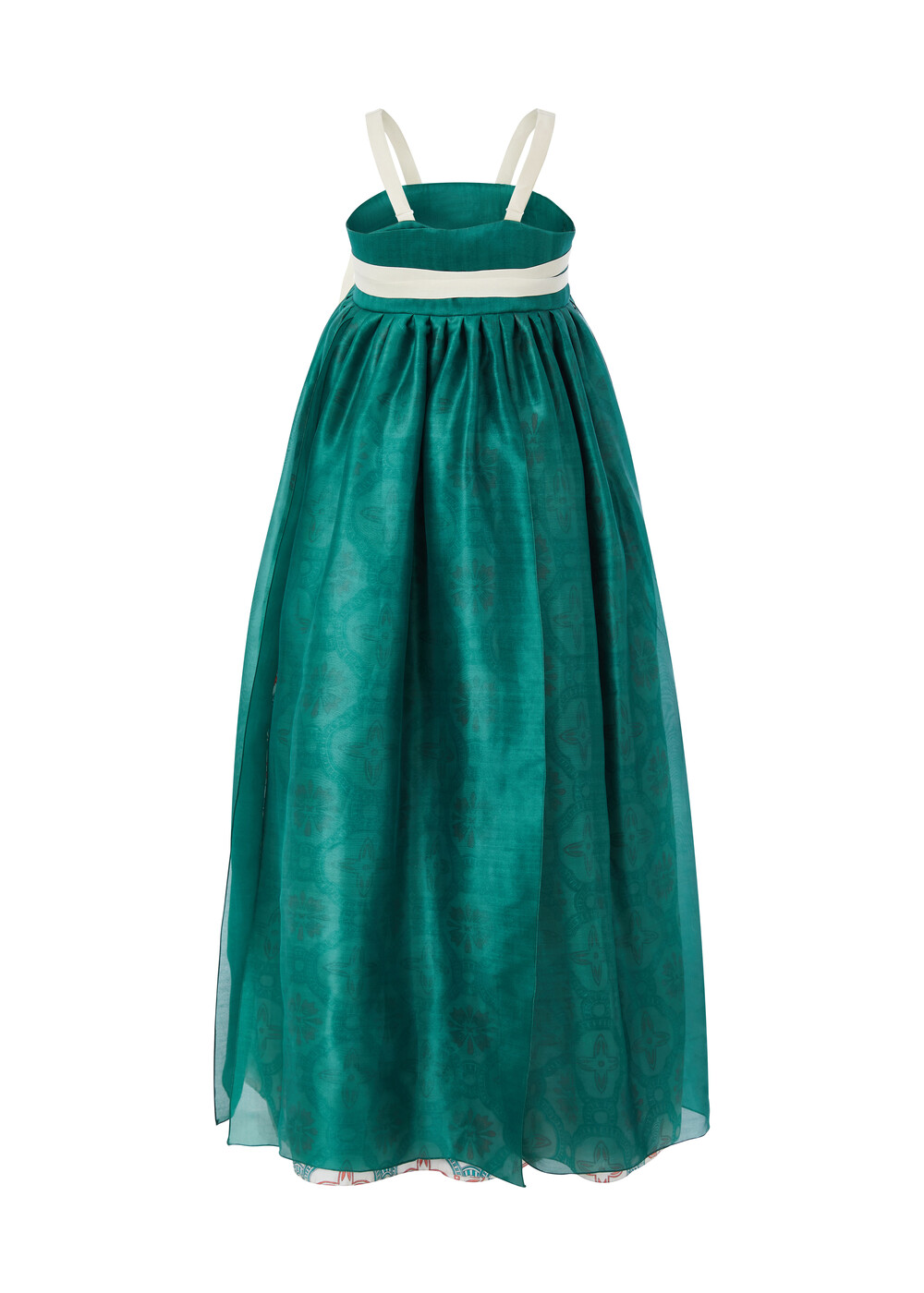단하의 명주라인 드레스로 나비문 패턴이 들어간 갈래 드레스입니다.