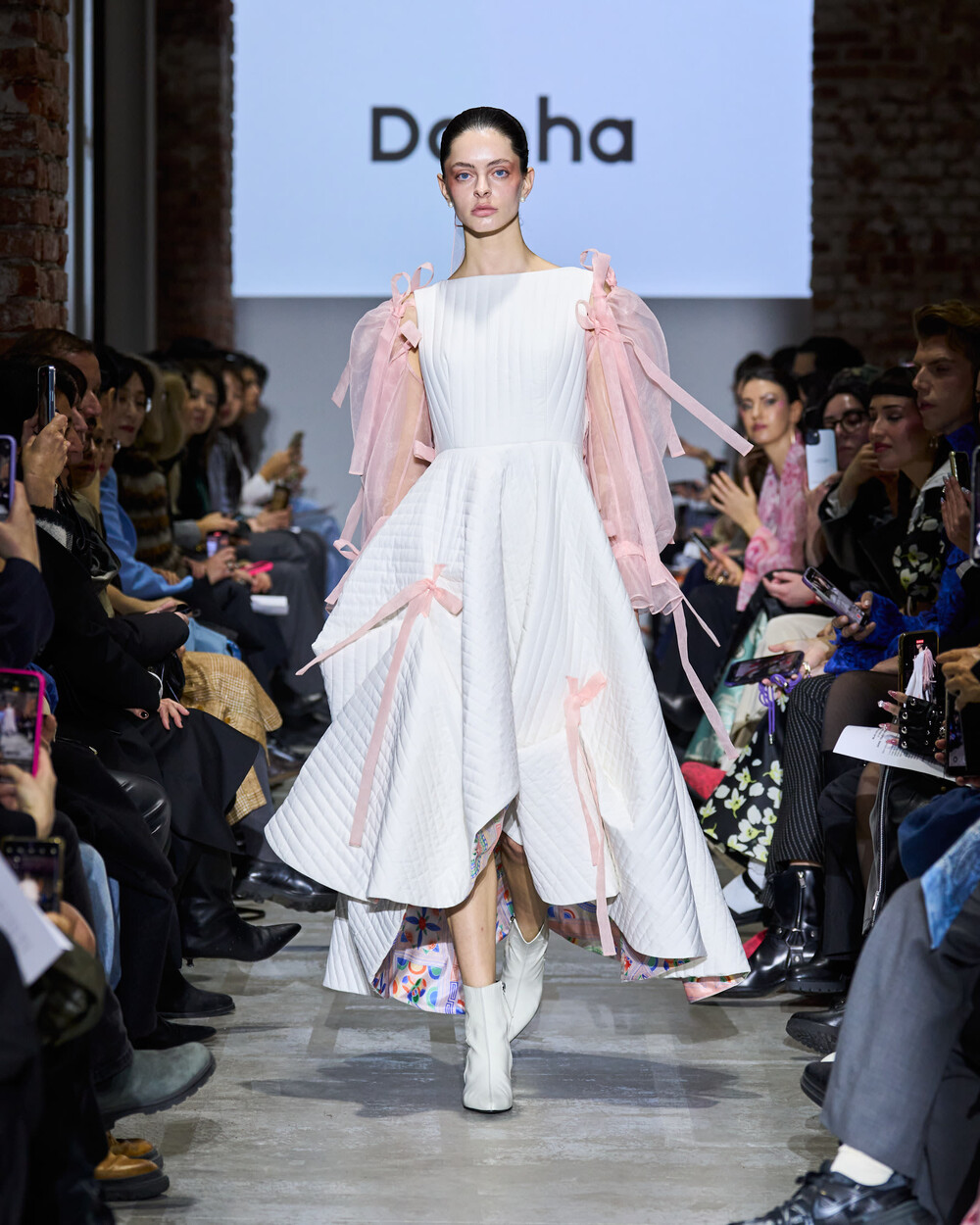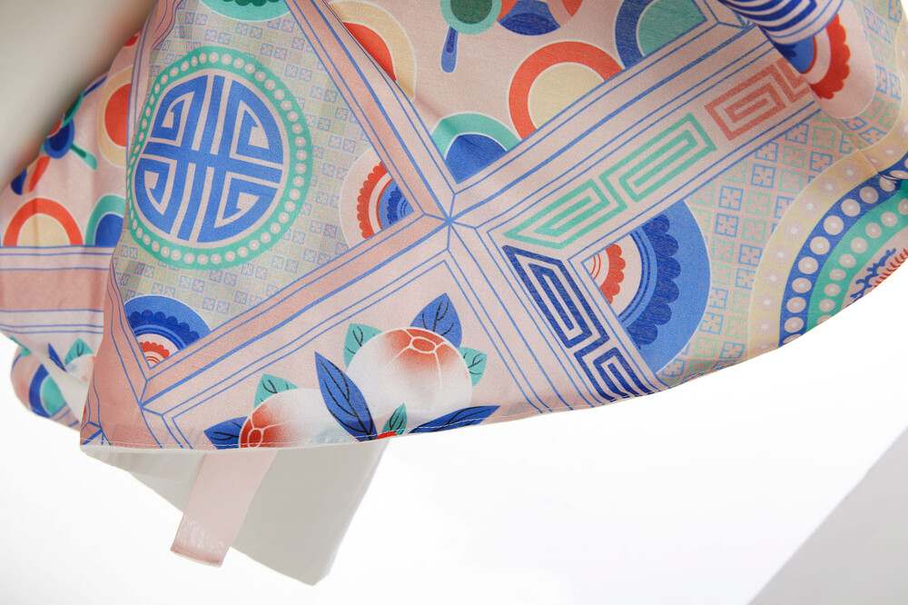 드레스 안쪽에는 봉황문 인문보 과실문 핑크 패턴이 배색되어, 걸을 때마다 드레스의 흐름과 함께 우아함을 더욱 강조합니다. 2024 FW 밀라노 패션위크의 피날레를 장식하며 큰 관심을 모은 특별한 아이템입니다.