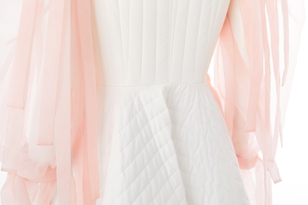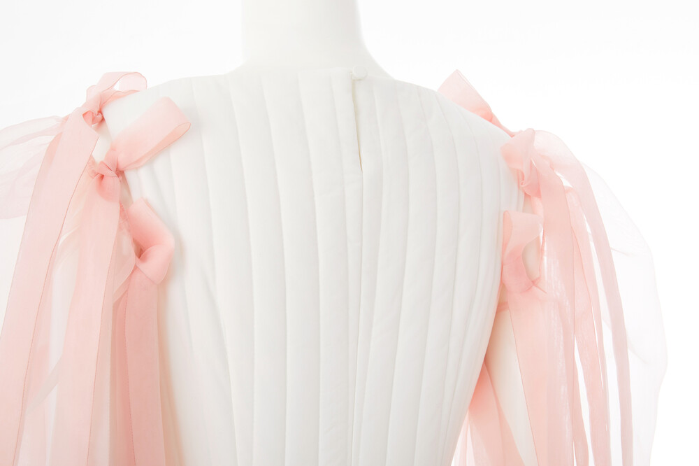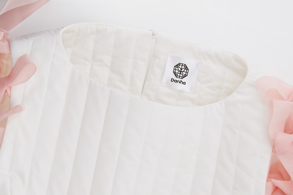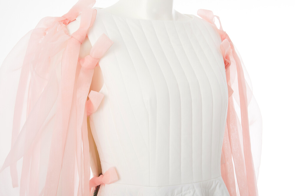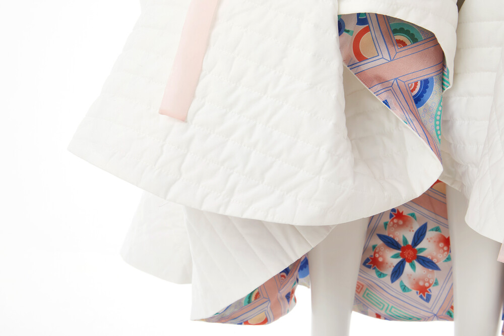 과실문 누빔 피날레 드레스는 한국 전통 누빔 기법으로 제작된 원단을 사용해 따뜻하고 포근한 느낌을 제공합니다. 리본을 묶는 방식에 따라 스커트의 길이감을 조절할 수 있어 개성 있는 실루엣을 연출할 수 있습니다.
