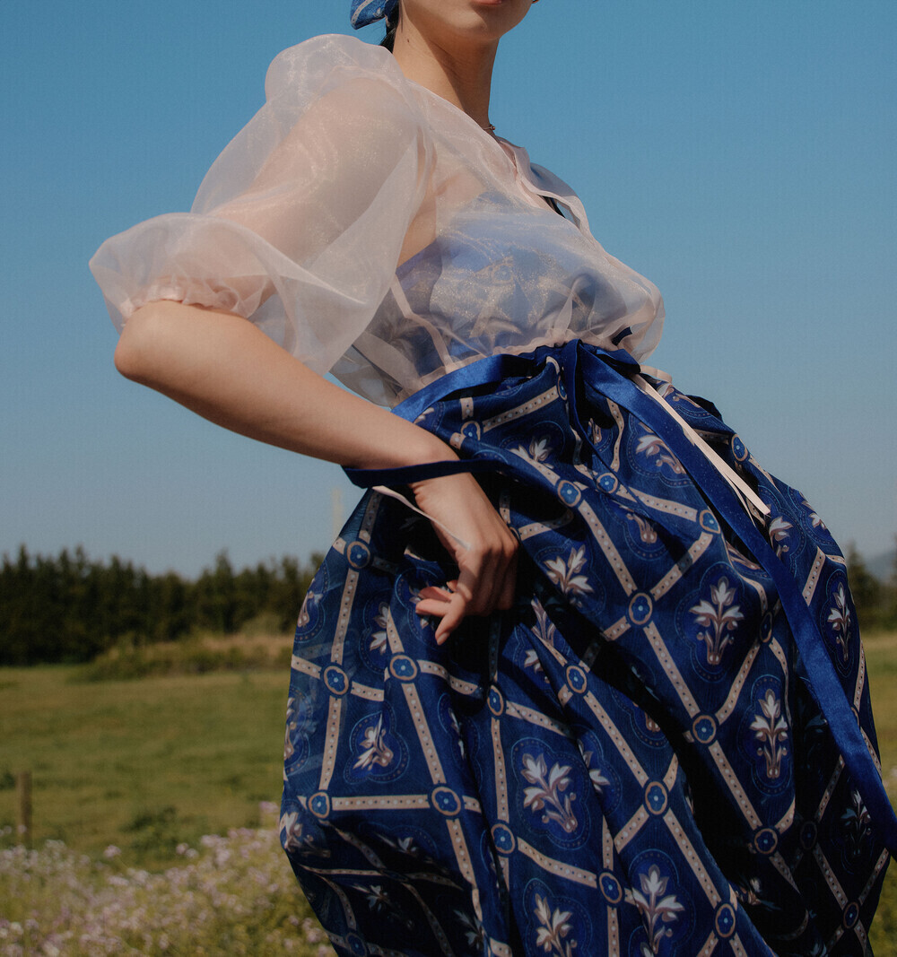 * 단령 깃 볼레로 핑크색상과 당초문 드레스를 함께 연출한 사진입니다.