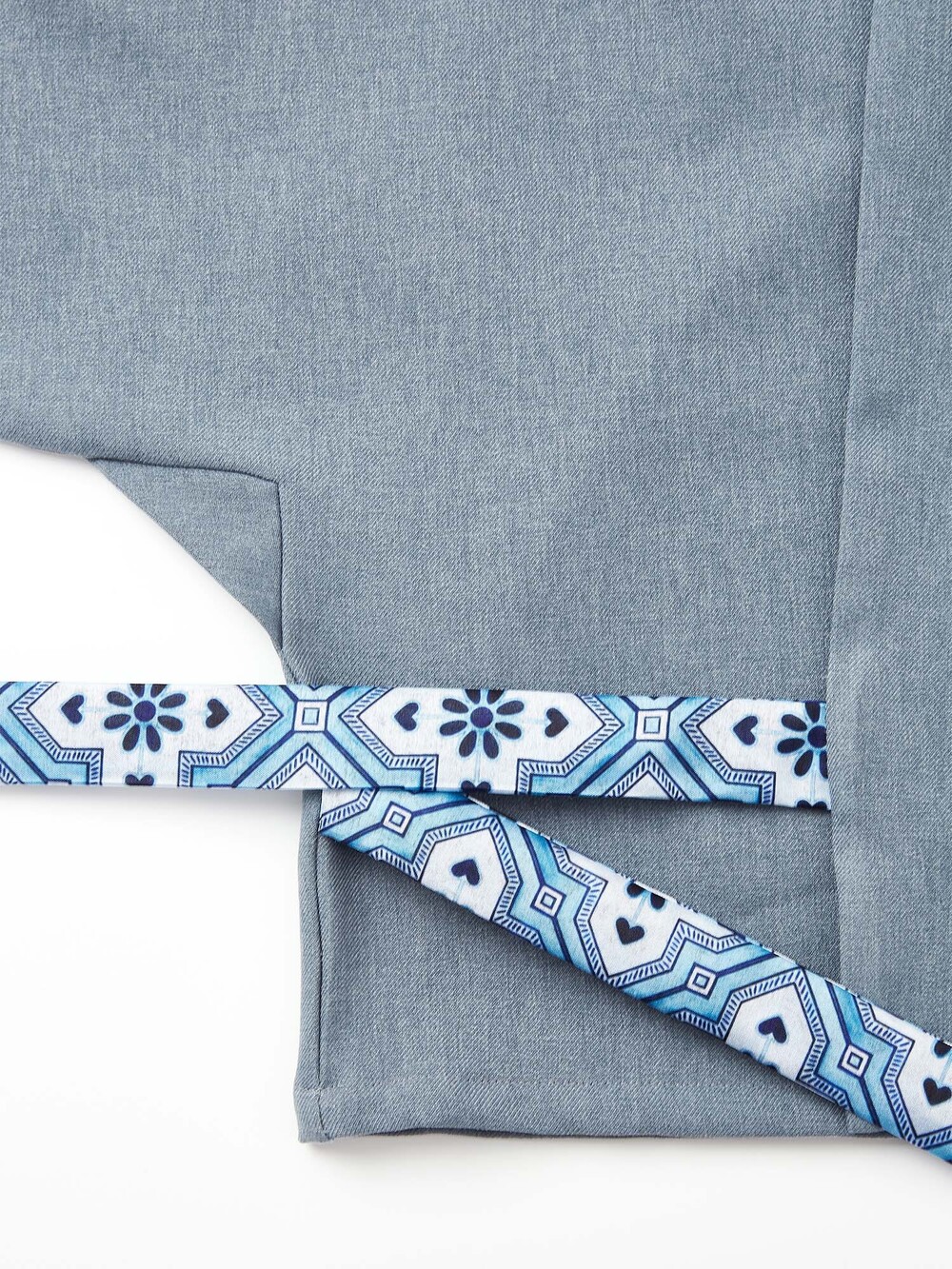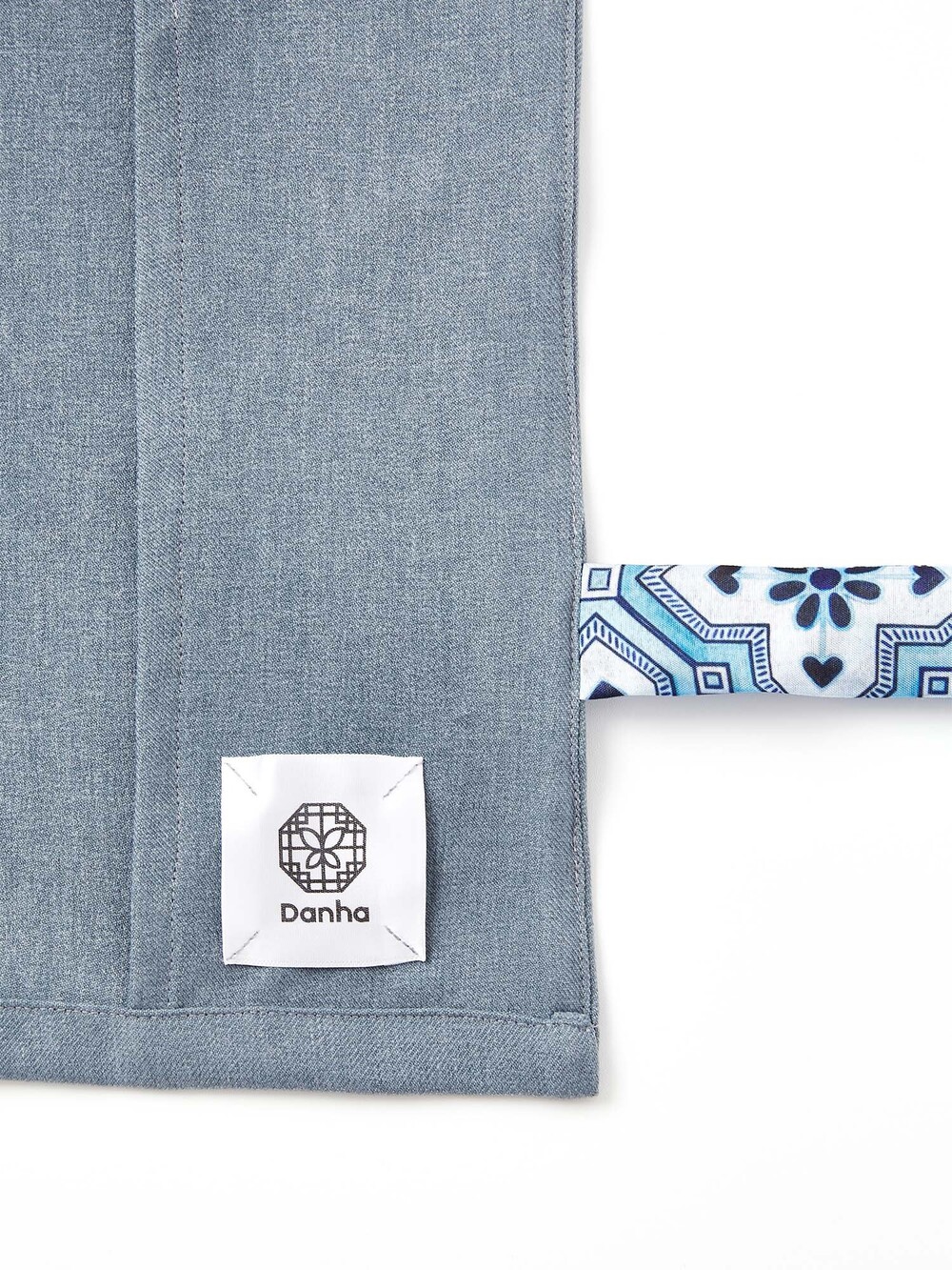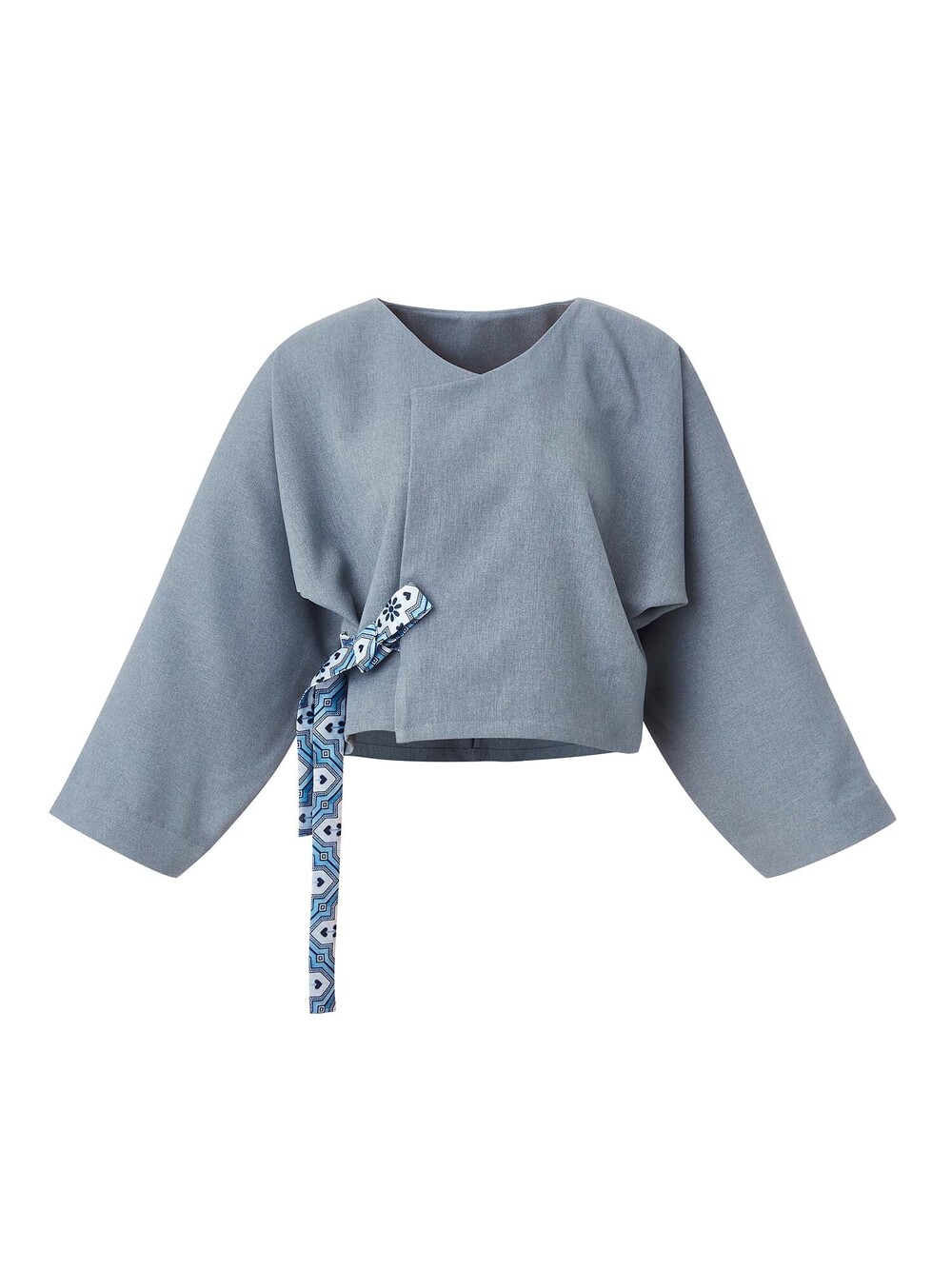 마고자 재킷은 조선 궁중 도배지 패턴인 홍국화 백분문의 파란 색상인 청국화 문양의 고름 포인트가 있습니다.