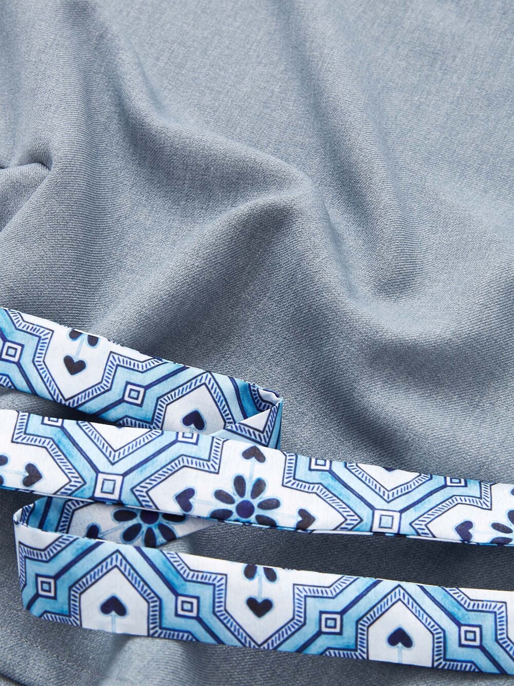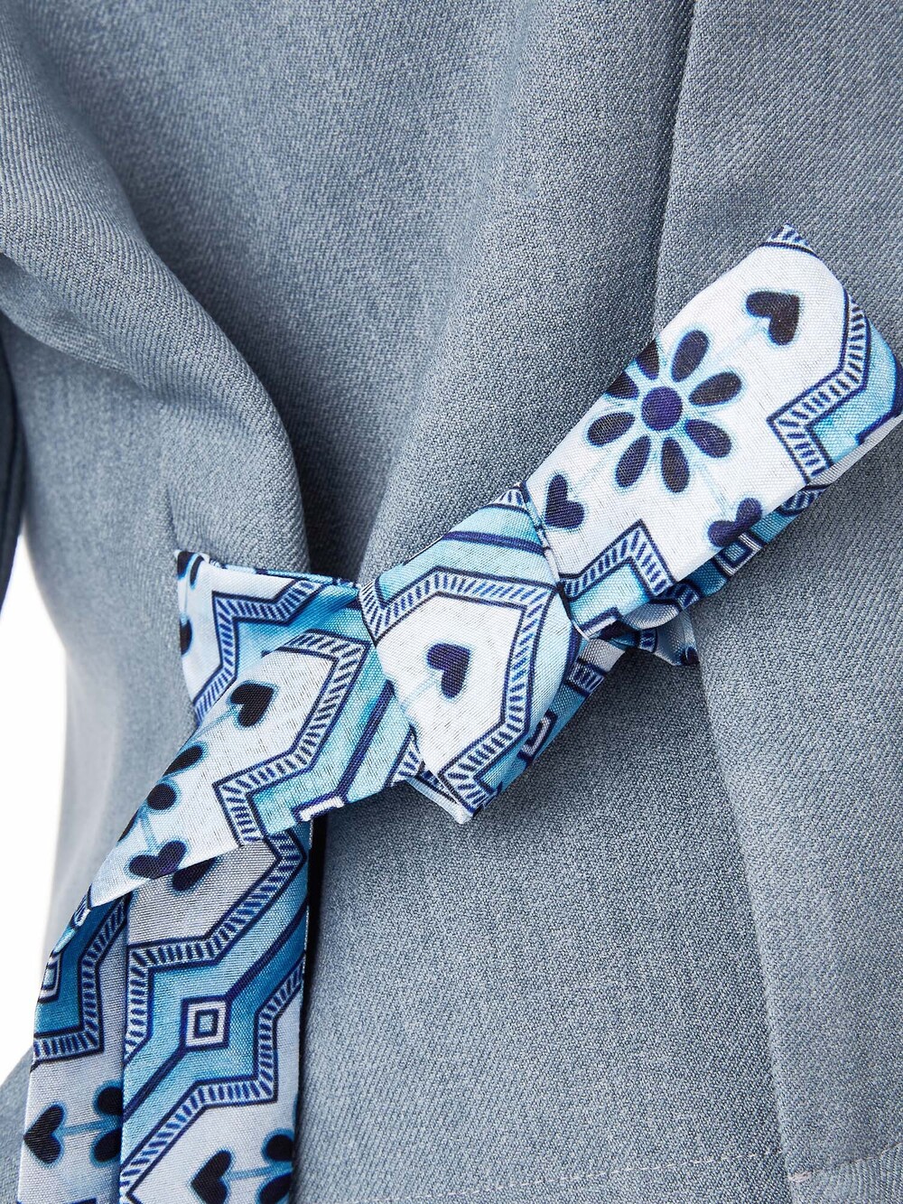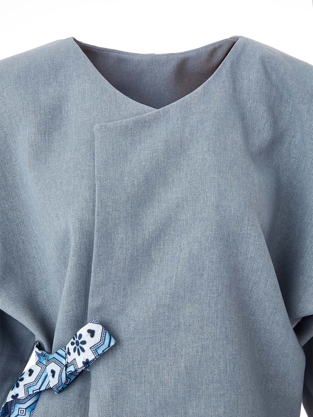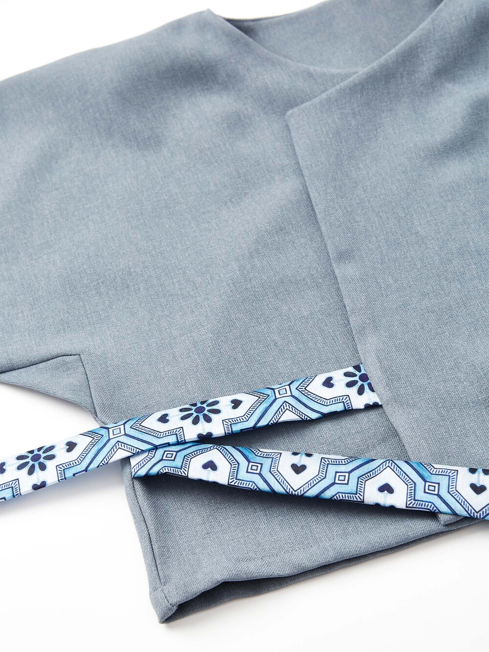 마고자 재킷은 조선 궁중 도배지 패턴인 홍국화 백분문의 파란 색상인 청국화 문양의 고름 포인트가 있습니다.
