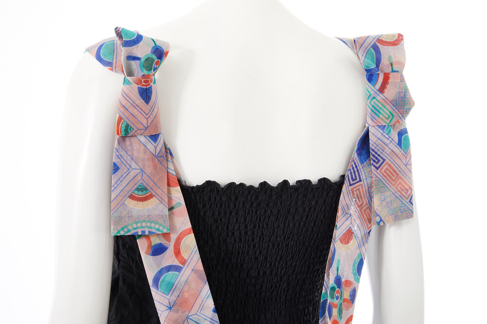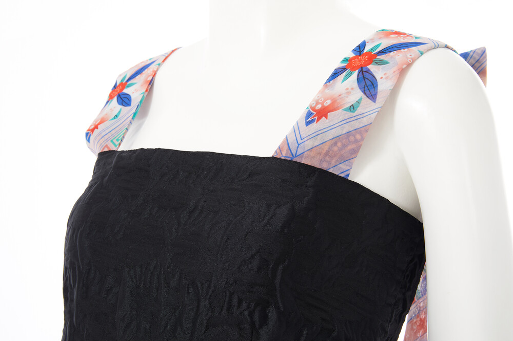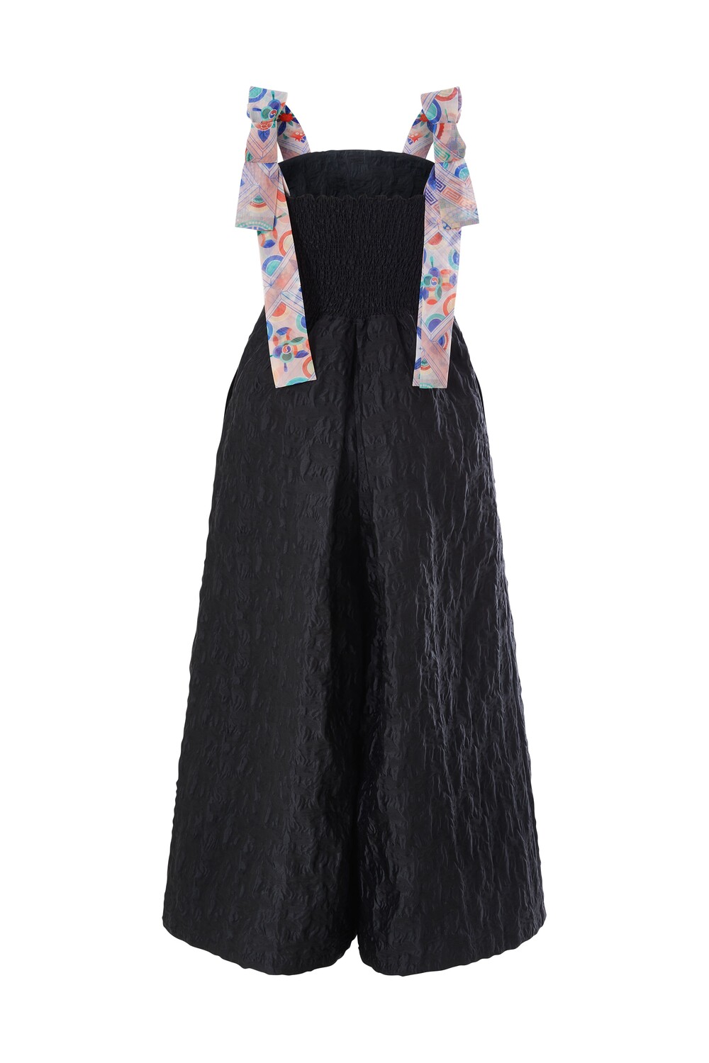 자가드 리본 점프수트는 자가드 원단 특유의 텍스처로 유니크함을 더한 아이템입니다. 깔끔한 일자 탑 라인에 단하의 시그니처 봉황문 인문보 과실문 패턴의 리본 디테일을 더해 어깨에 묶어 높이 조절이 가능하며, 리본을 안으로 넣어 심플하게 연출하거나 홀터넥 스타일로도 활용할 수 있습니다.