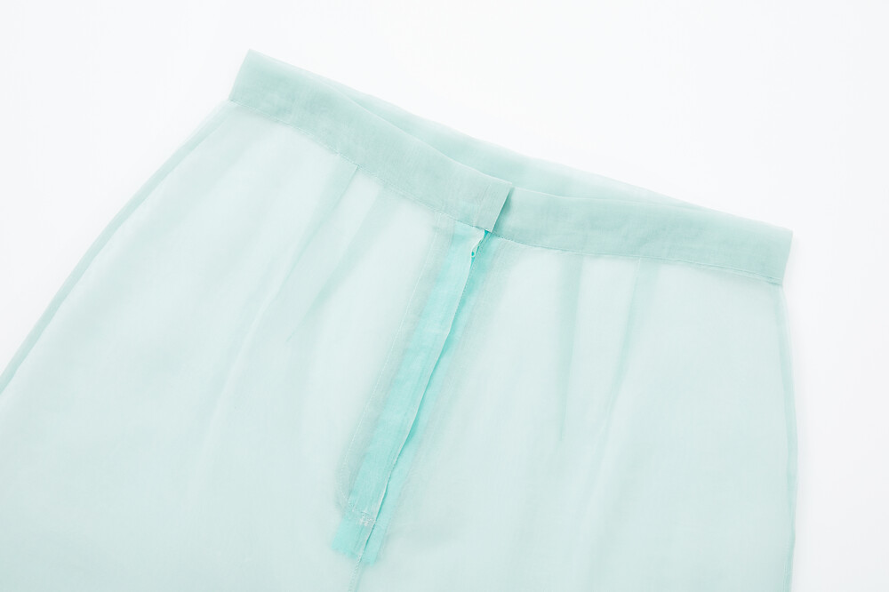 민트 시스루 팬츠는 은은한 비침이 있는 실크 소재로 제작되어 고급스러움과 가벼운 착용감을 동시에 제공합니다. 얇고 일자로 떨어지는 실루엣이 세련된 핏을 완성하며, 긴 상의나 원피스와 레이어드하기에 적합한 디자인입니다. 비침이 있는 특성상 단독으로 착용하기보다는 레이어드 스타일로 연출해 우아하고 독특한 매력을 살리기를 추천합니다.