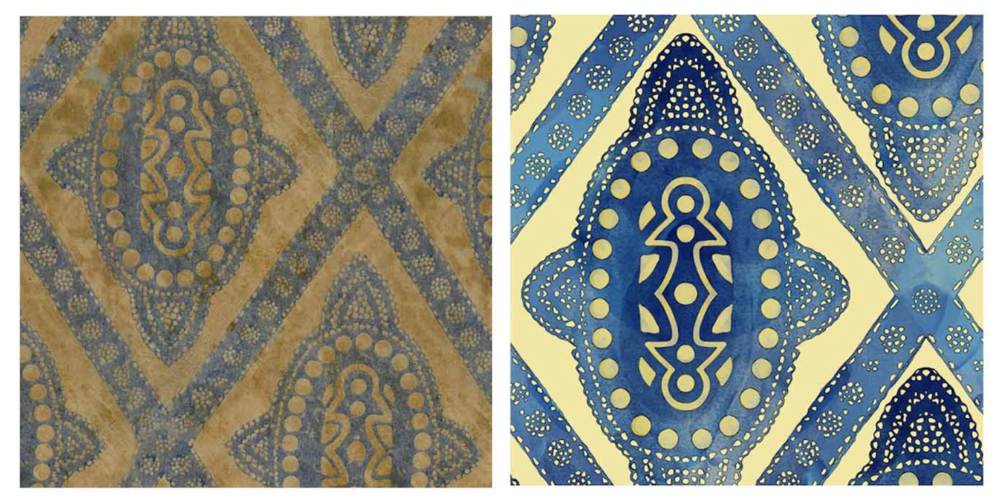 복합문 3점은 청수로복문백분지와 귀갑문, 백색당초문바탕청룡문으로 구성되어있고, 그 중 귀갑문 도배지는 청색의 안료로 이루어져 있었는데, 청색은 한국 전통 색 중에서도 아주 뒤한 색으로 여겨 높은 신분 사람들의 복식이나 중요한 장소에 주로 사용된 색 입니다. 단하의 거북문은 귀갑문의 청명한 청색을 살려 리디자인 되었습니다. 귀갑은 등껍질을 뜻하고, 십장생의 하나인 거북이의 등겁질 모양과 같은 문양으로 육가형을 사방으로 전개한 문양입니다. 거북이는 도안화한 것으로 보이며, 이것은 장수를 기원하는 것으로 볼 수 있습니다.