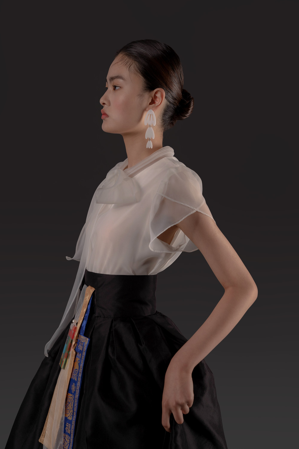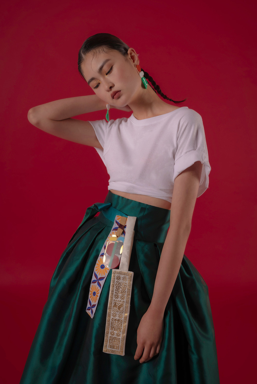 베이지 스커트 + 쪽색 네모부리(특대) + 소색 네모부리(대)를 함께 연출한 사진입니다 (귀걸이,아크릴노리개는 ARC MIND)