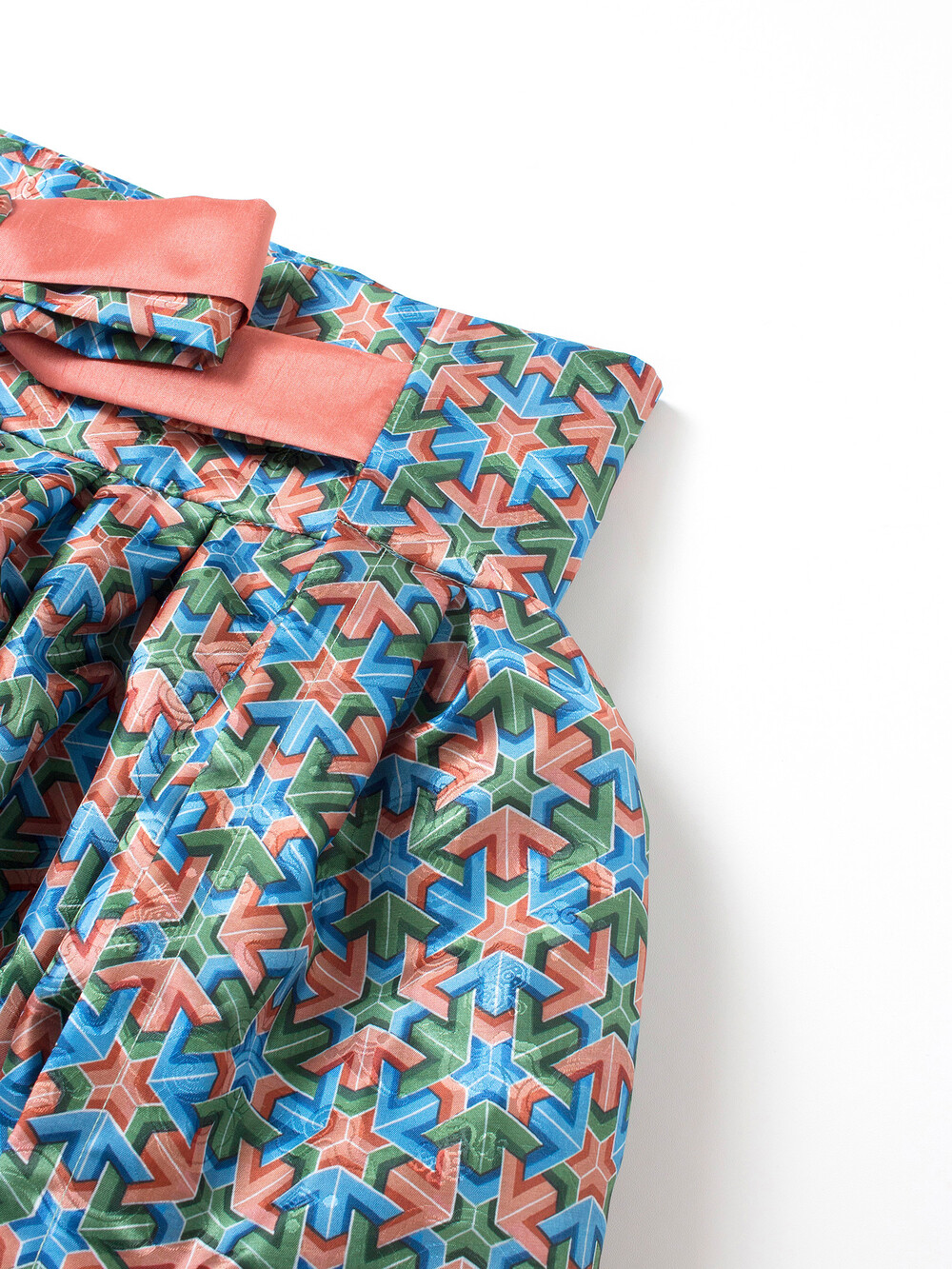 둘러입는 랩 형태이며 살구빛 말기 리본이 고급스러운 포인트가 됩니다.