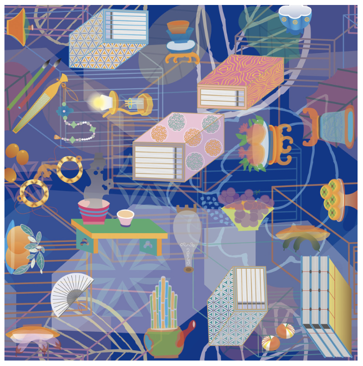 이 전경 작가는 옛날의 귀한 것들과 지금의 흔한 것들을 그리고 있습니다. 면상필을 잡기도 하고 마우스를 잡기도 합니다. 위계와 시대와 의미와 재료를 섞어서 작가가 지금 보고 있는 전통을 그립니다. 이 전경 작가의 책가도(청공도)는 강세황의 책가도-청공도淸供圖 에서 영감을 받았습니다. 청공이란 문인의 맑고 깨끗한 생활에 필요한 기물을 가리키는 용어로 문방구와 장식물을 의미합니다. 크게는 책가도라는 카테고리 안에서 옛날에 귀했던 책과 문방구이지만, 작게는 우리가 매일 사용하는 손에 익은 책상의 모습입니다. 청공도의 기물은 몇 킬로바이트의 단순한 디지털 이미지이지만 하나하나의 의미는 귀하고 복되었습니다. 반복되고 나열된 문방구와 책의 이미지 속에서 자신의 책상을 찾는 모험을 해볼 수 있습니다.
