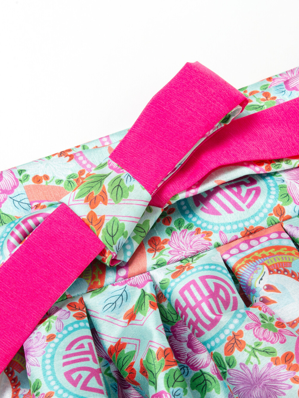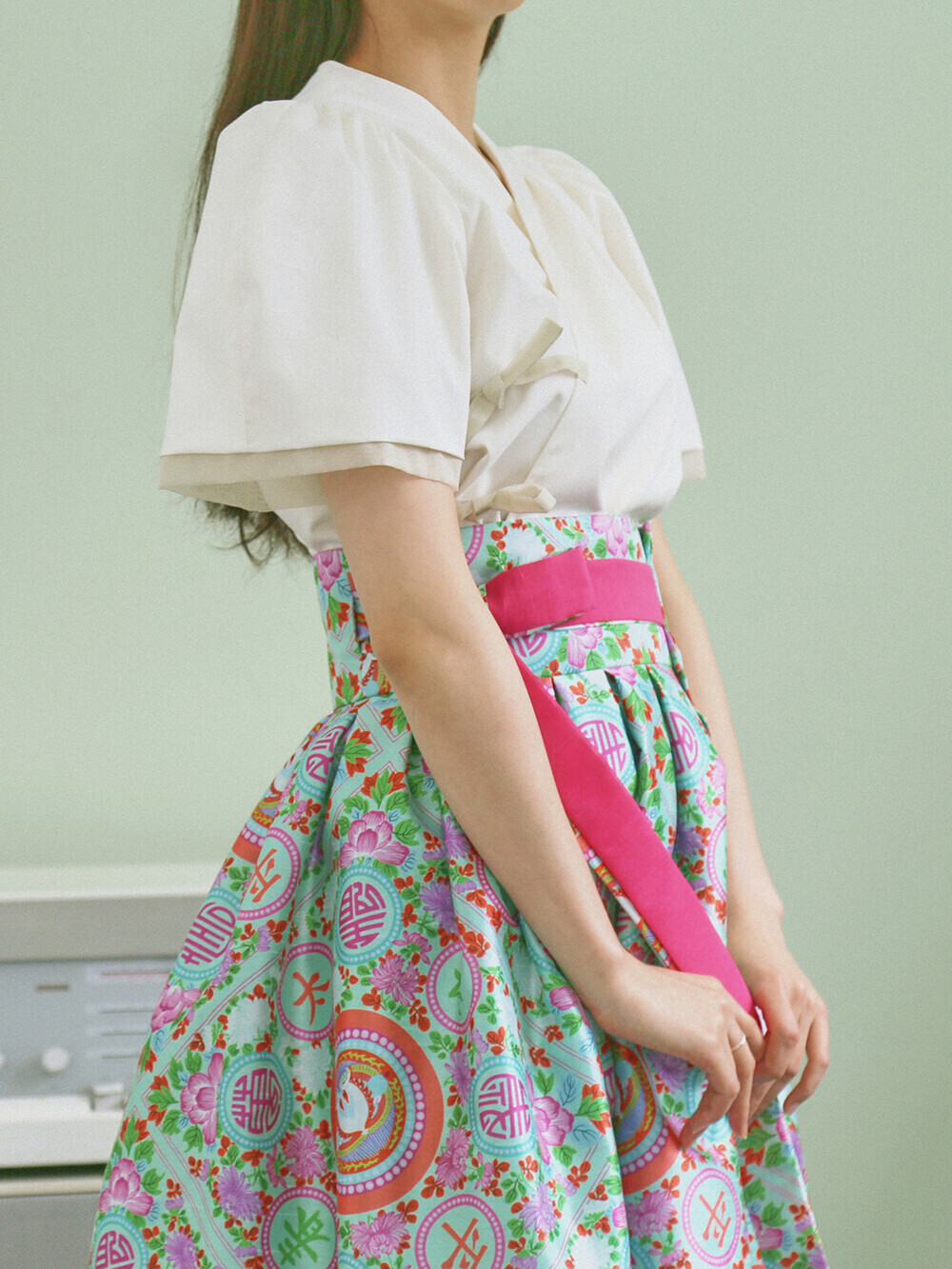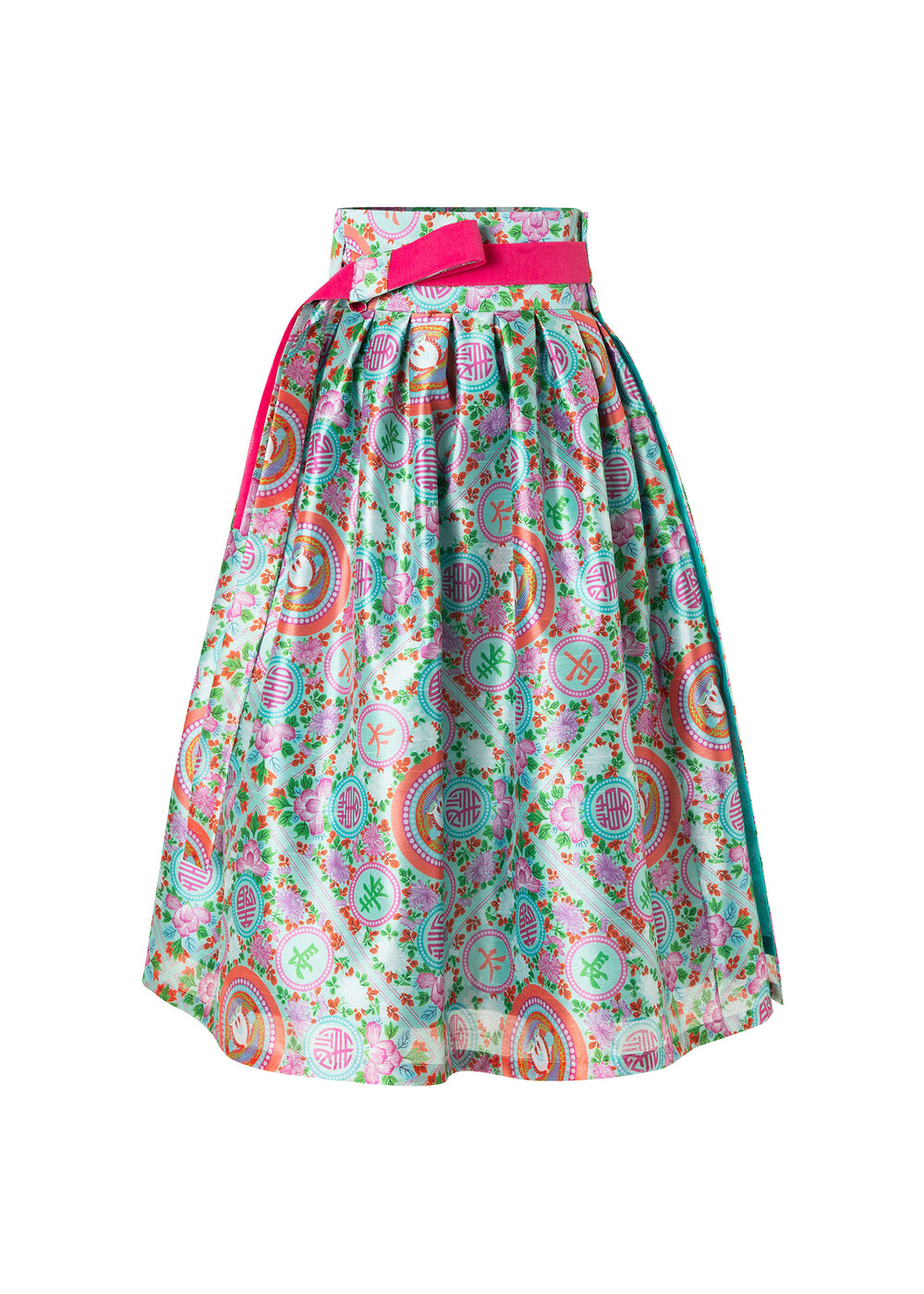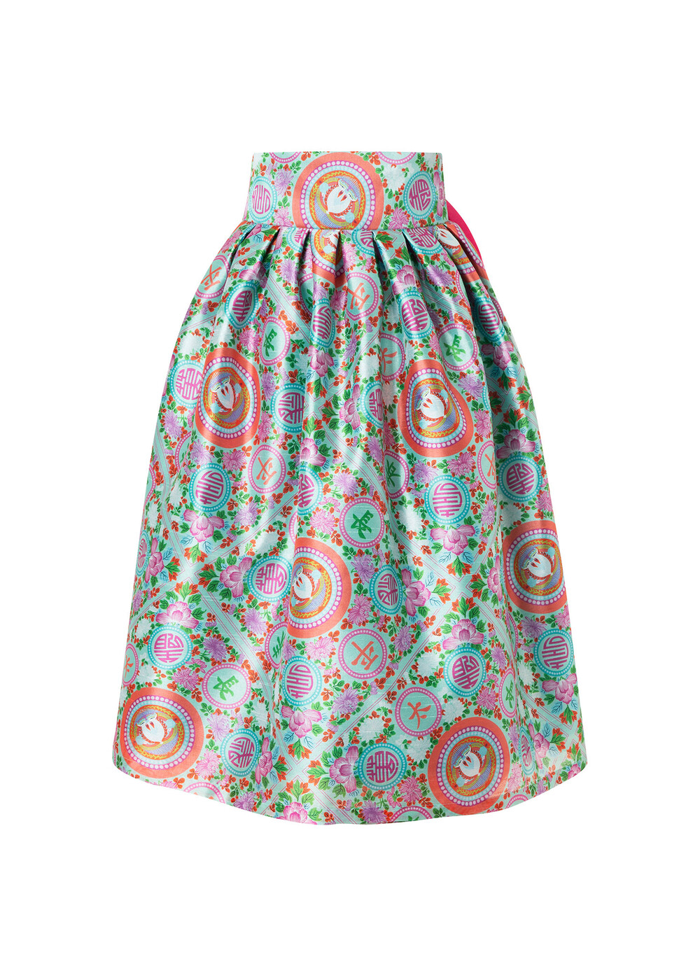 궁보치마 옥은 봉황문 인문보 태평성대 패턴으로 디자인된 둘러입는 랩스커트 제품입니다.