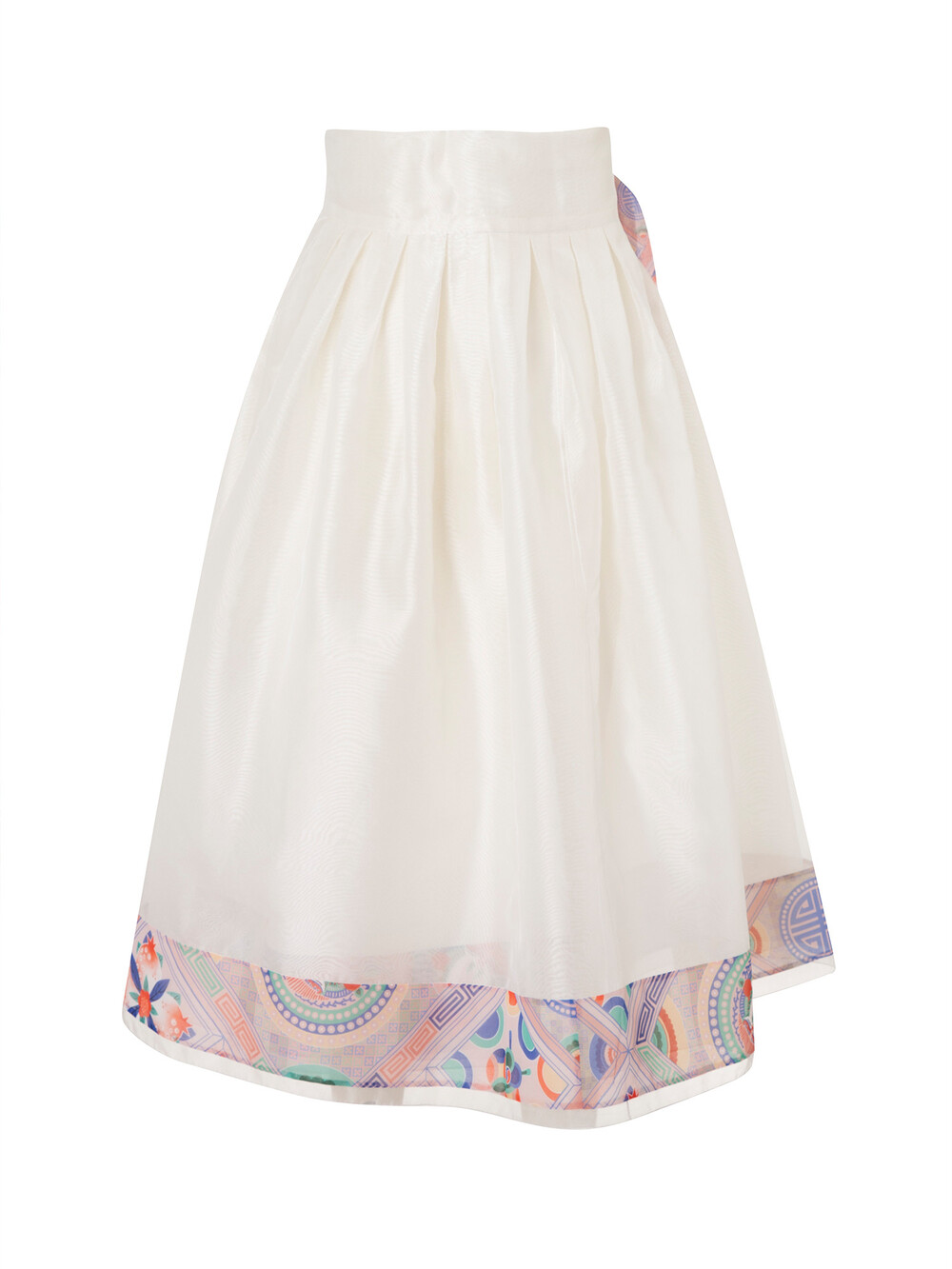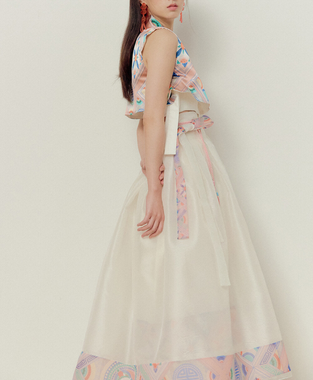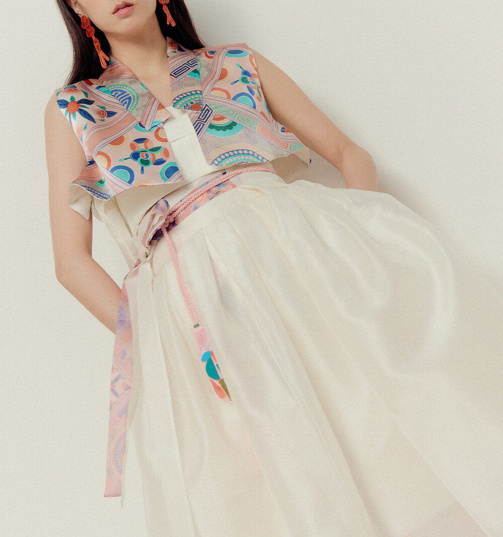 봉황단 치마는 조선 궁중 도배지 문양인 봉황문 인문보 연지 색상이