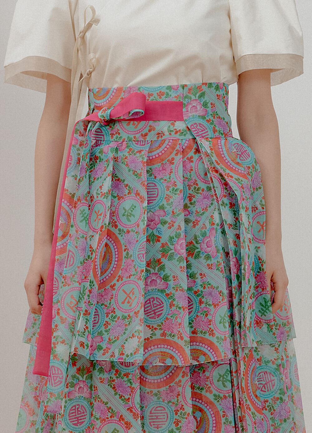 3단 무지기 플리츠 스커트 화문은 전통 무지기 치마를 모티브로 한 스커트입니다.