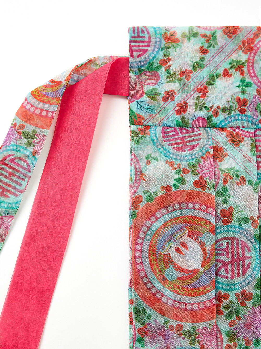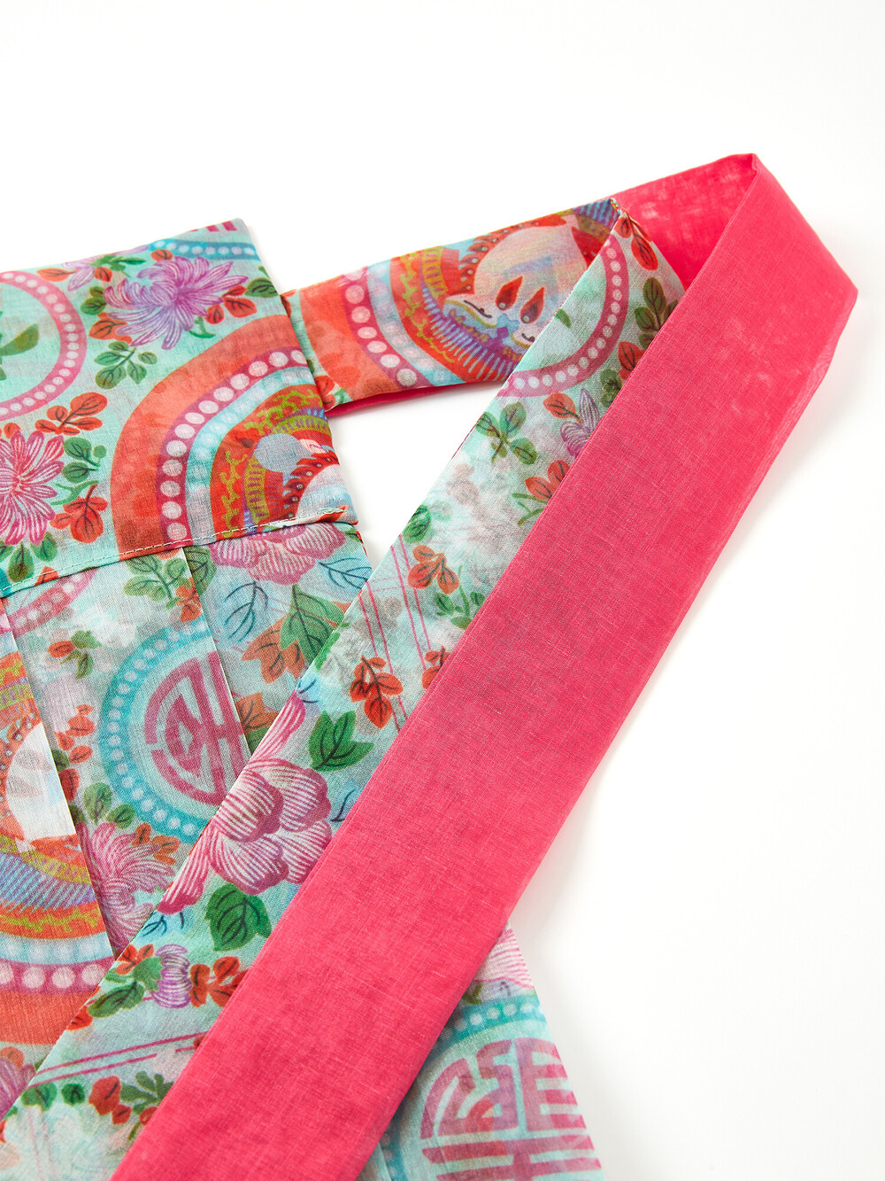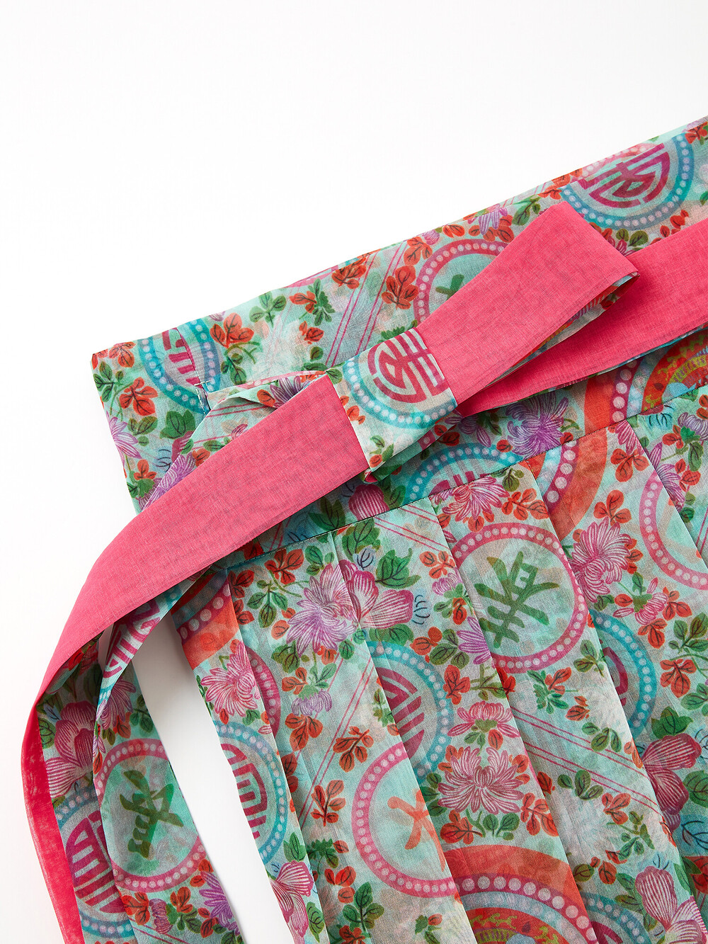 민트색 화문 패턴으로 디자인되고, 허리 리본은 진한 핑크로 포인트가 되어줍니다.