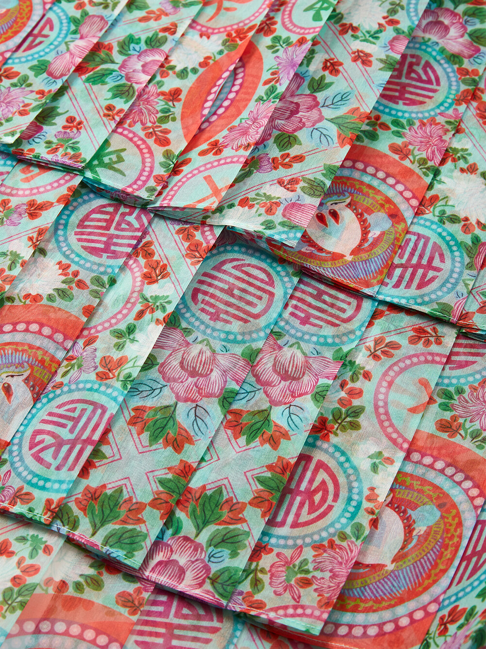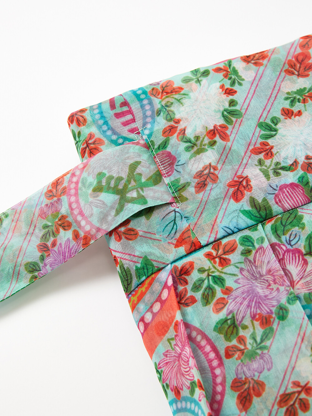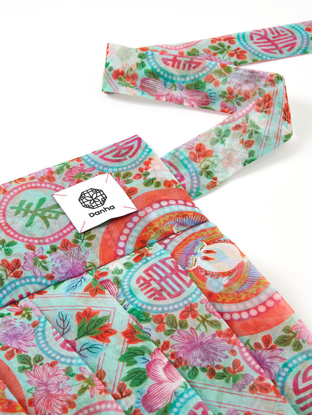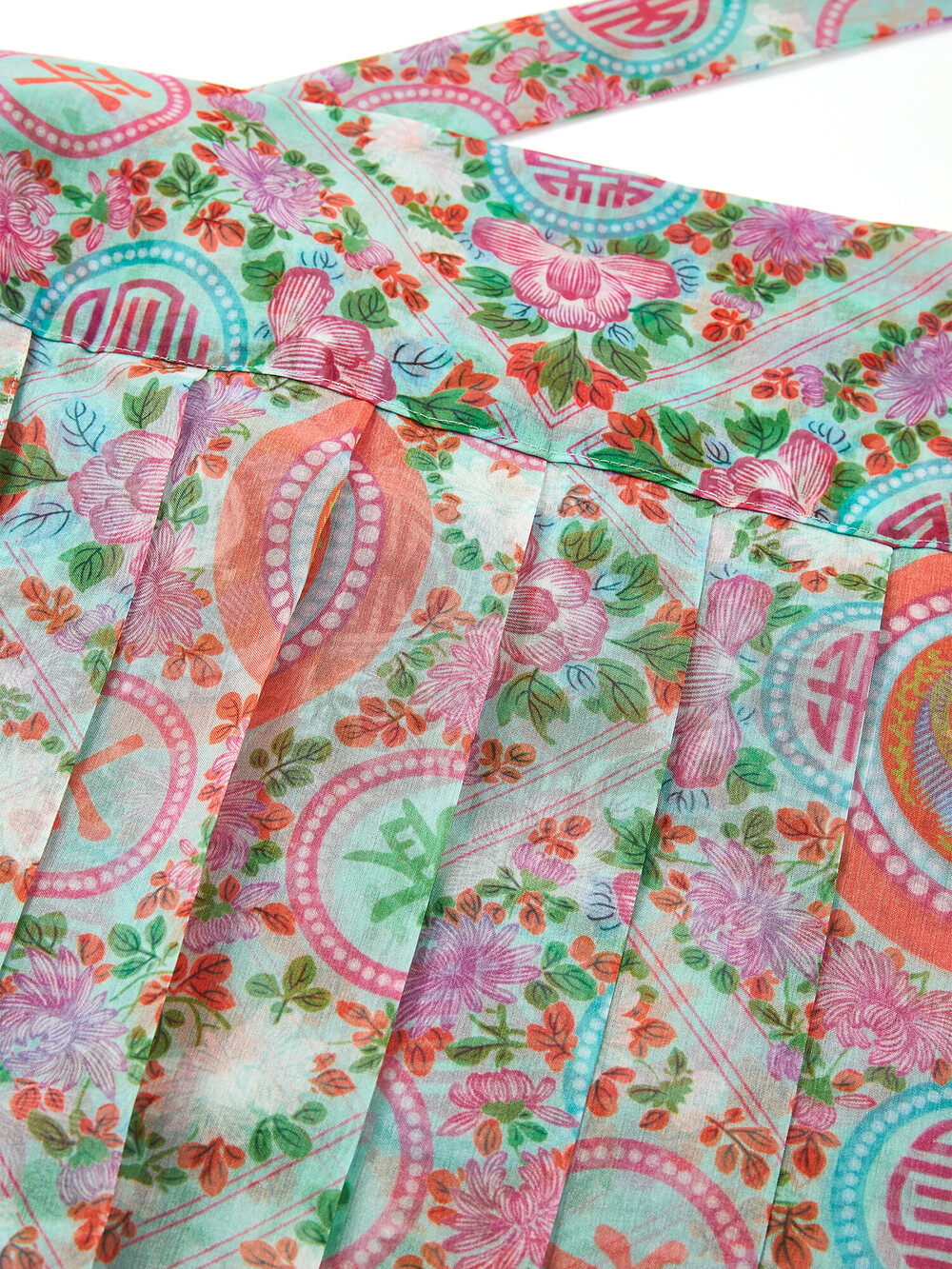 민트색 화문 패턴으로 디자인되고, 허리 리본은 진한 핑크로 포인트가 되어줍니다.