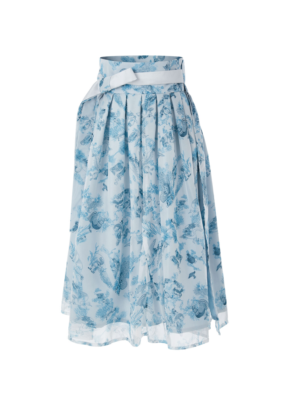 화조도 패턴과 어우러지는 컬러의 쉬폰 원단으로 이루어진 둘러입는 허리 치마입니다.