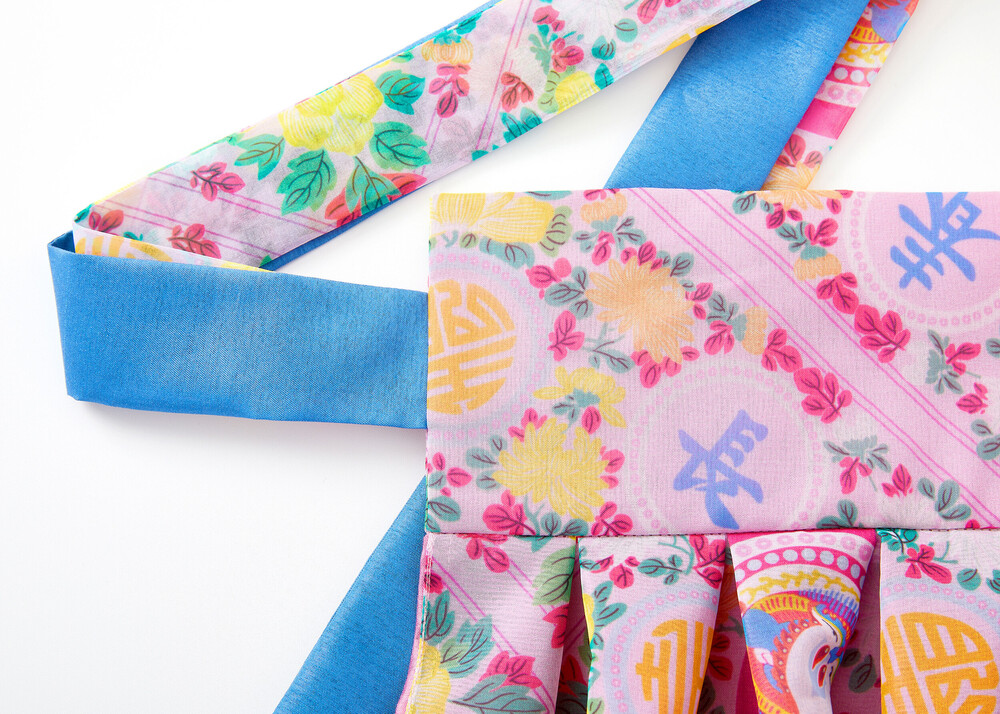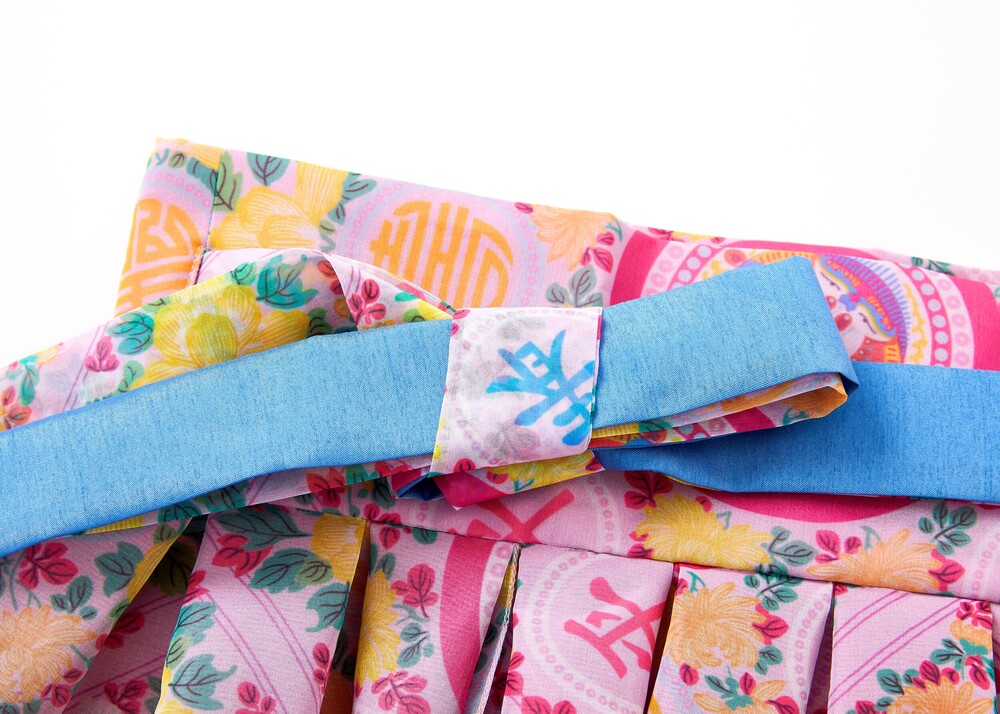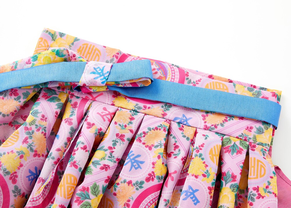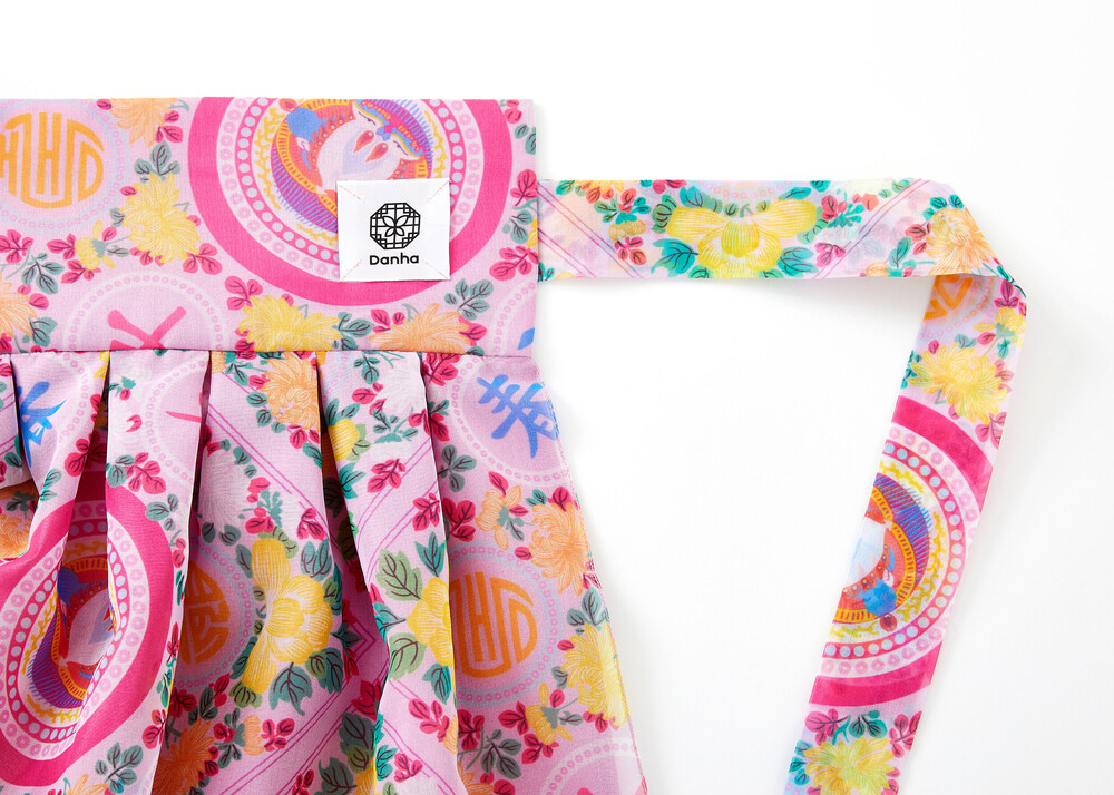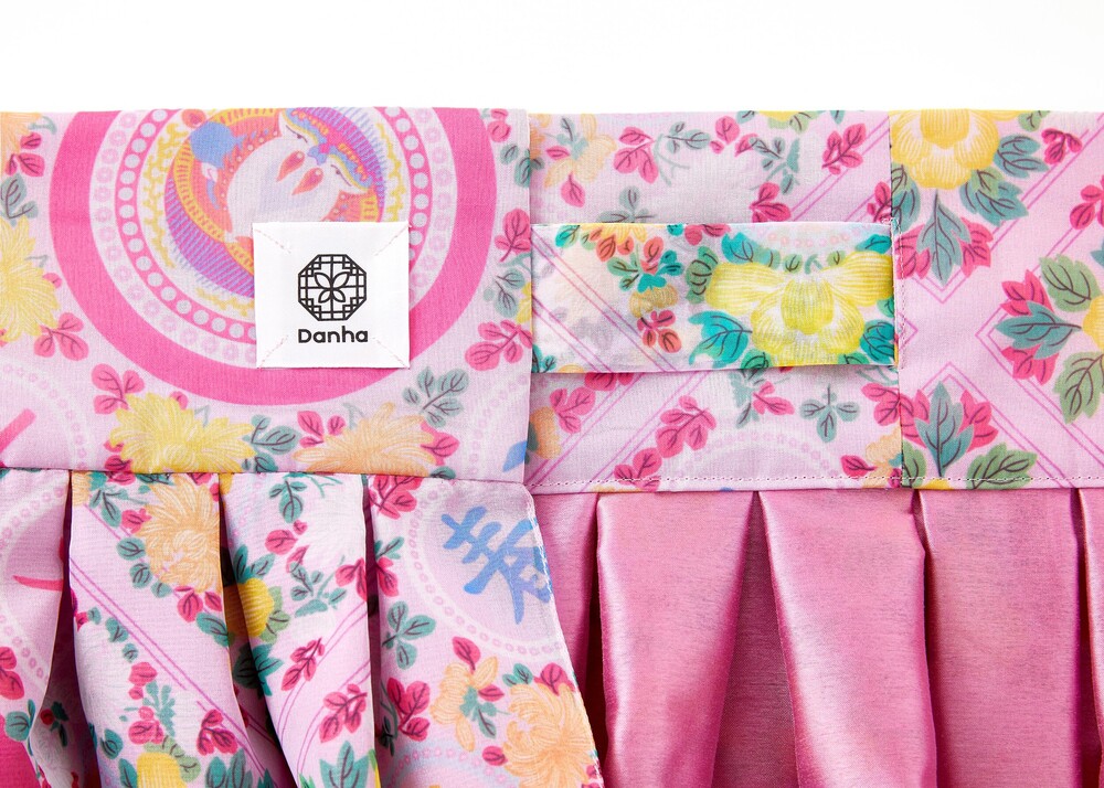 핑크색의 뉴 봉황문 패턴으로 발랄한 이미지가 돋보이는 허리 치마입니다.