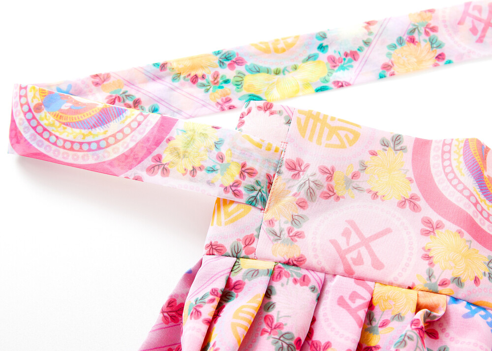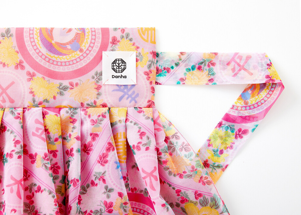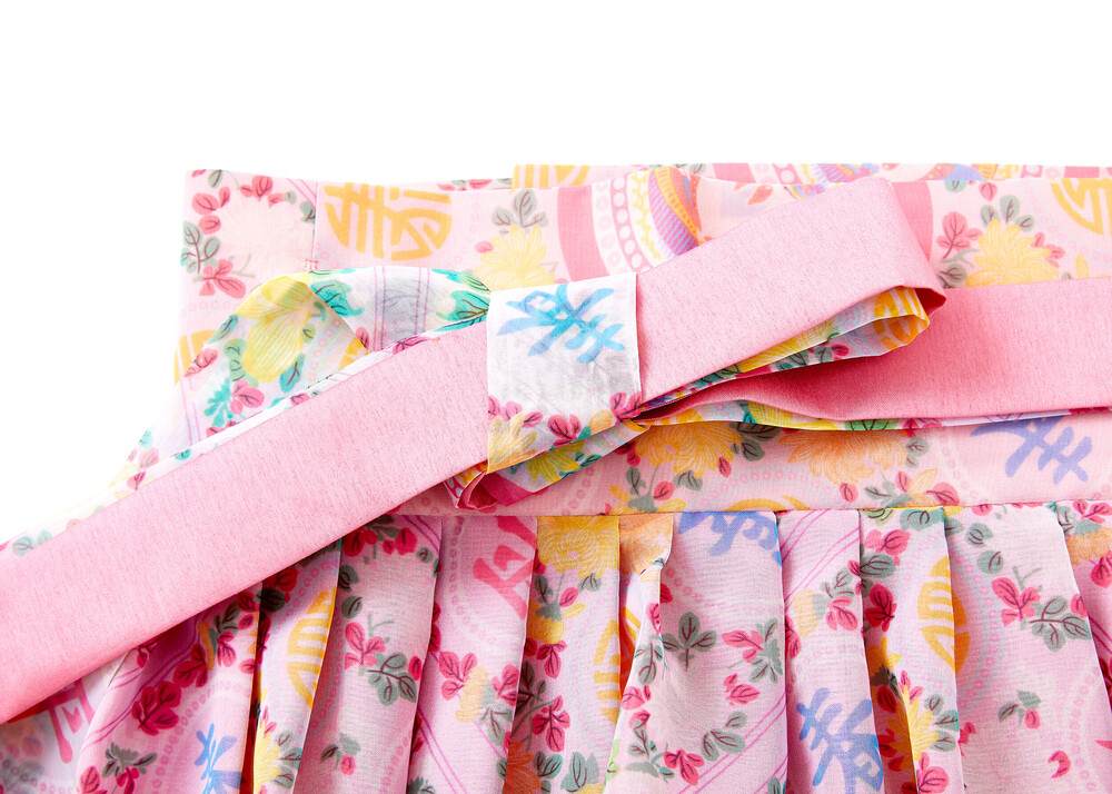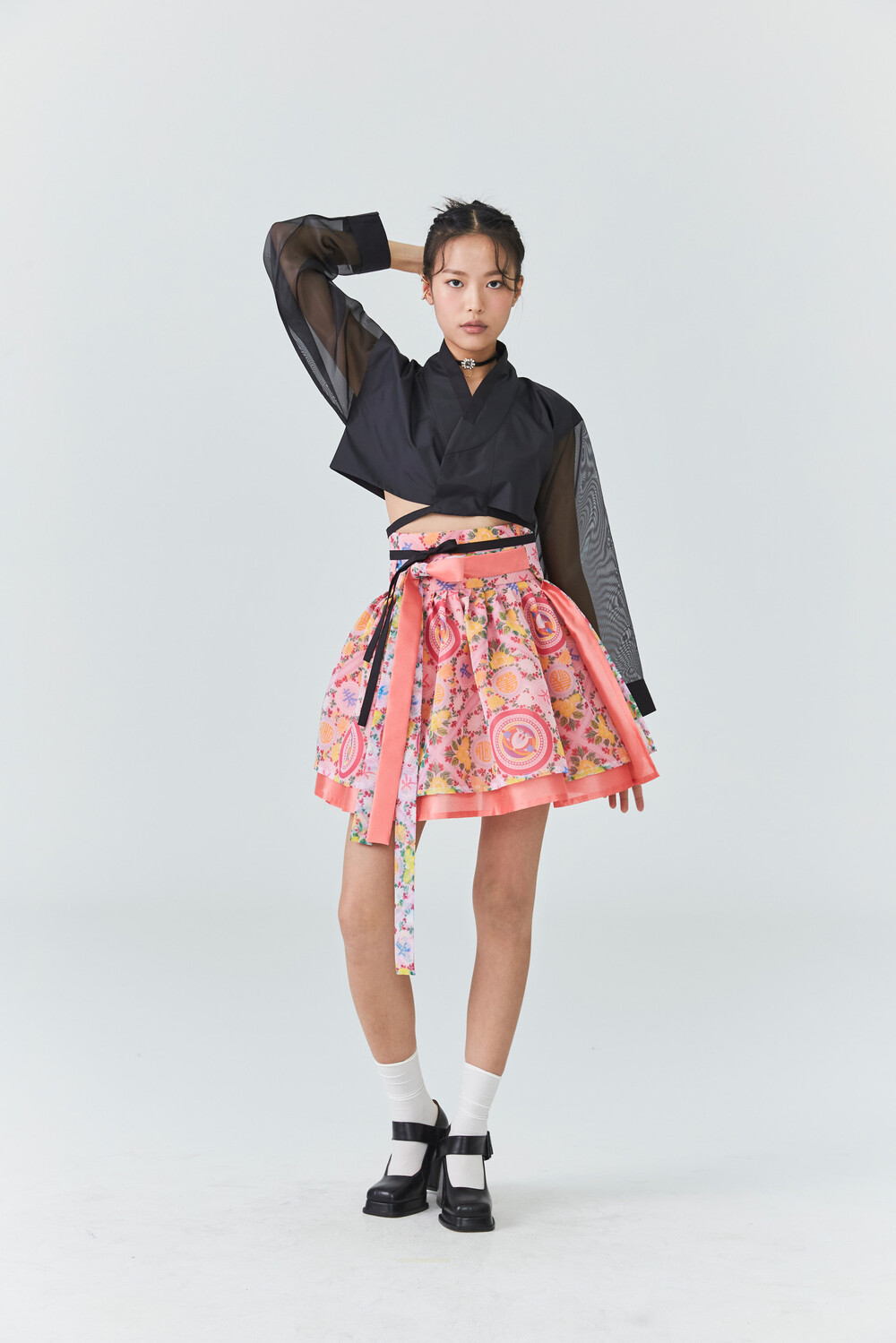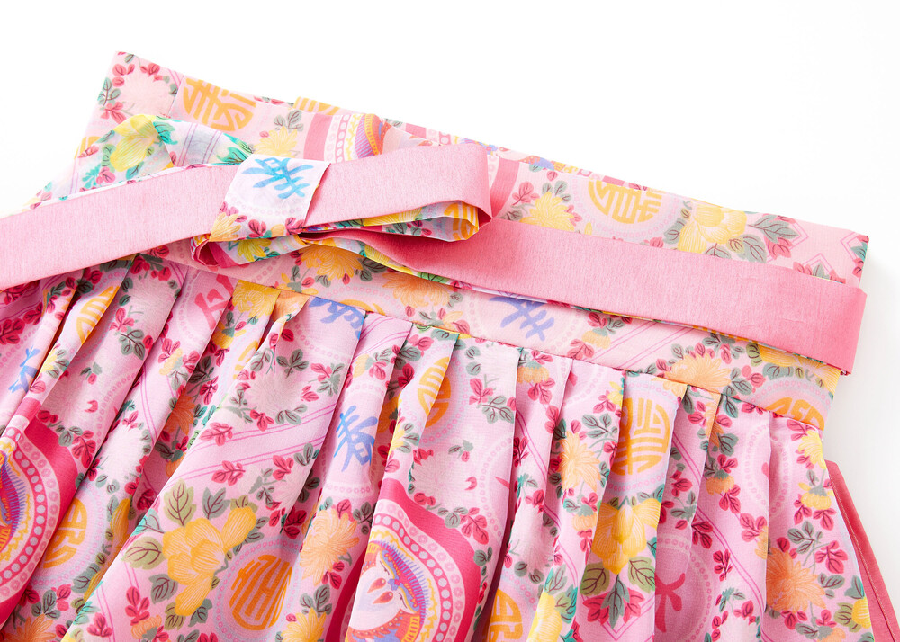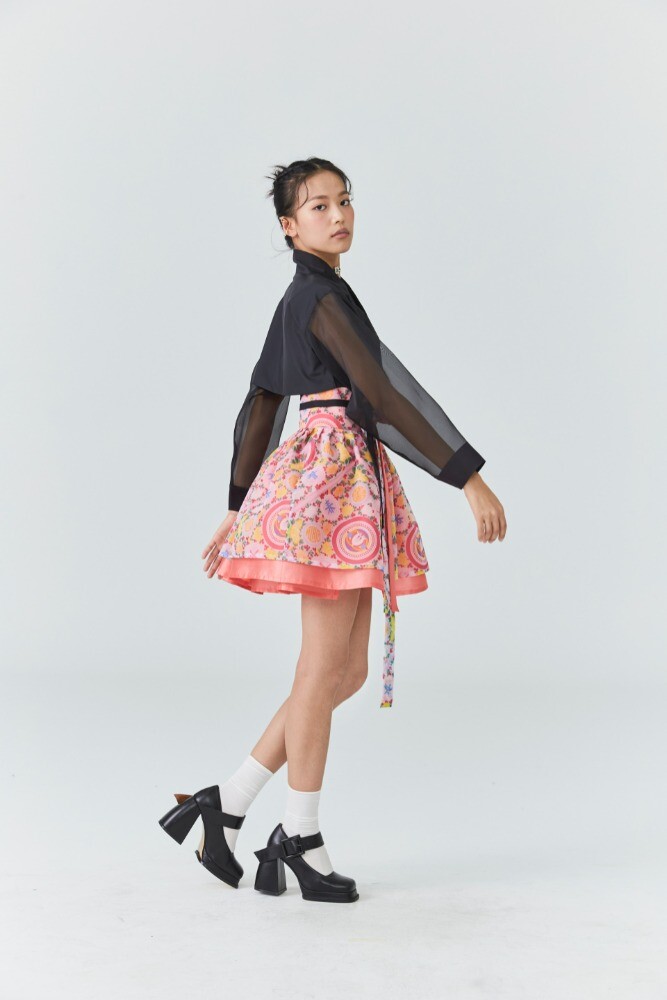 핑크색과 짧은 기장감으로 발랄한 이미지가 돋보이는 허리 치마로 한국적인 유니크한 디자인을 보여줍니다.