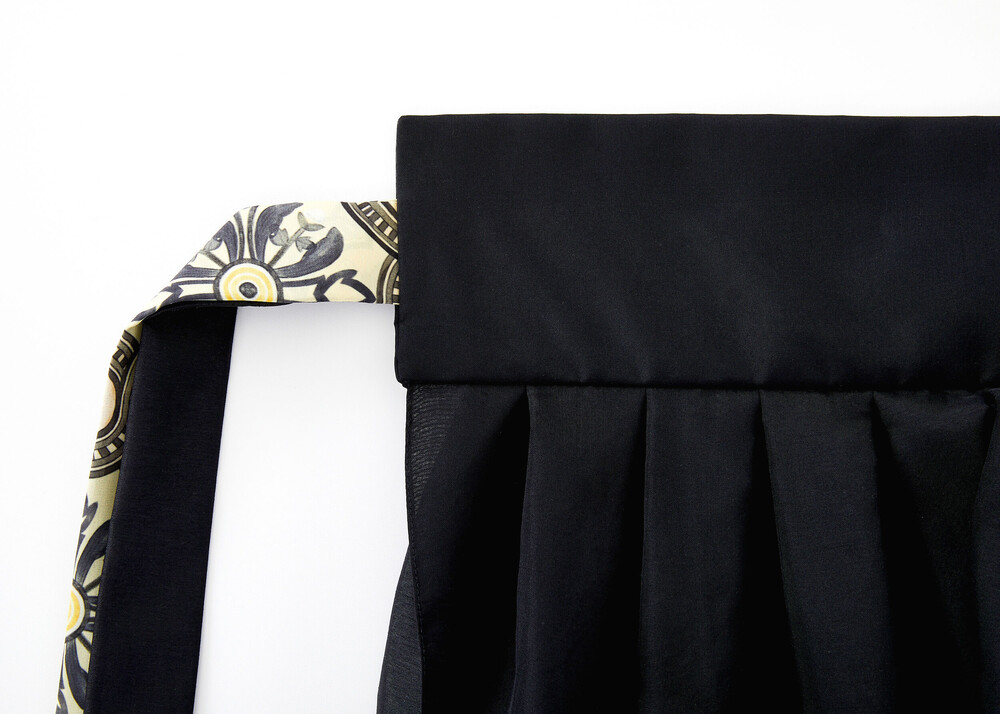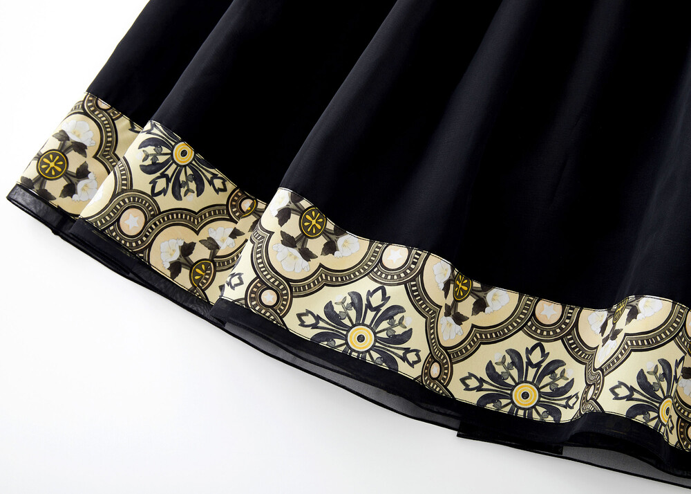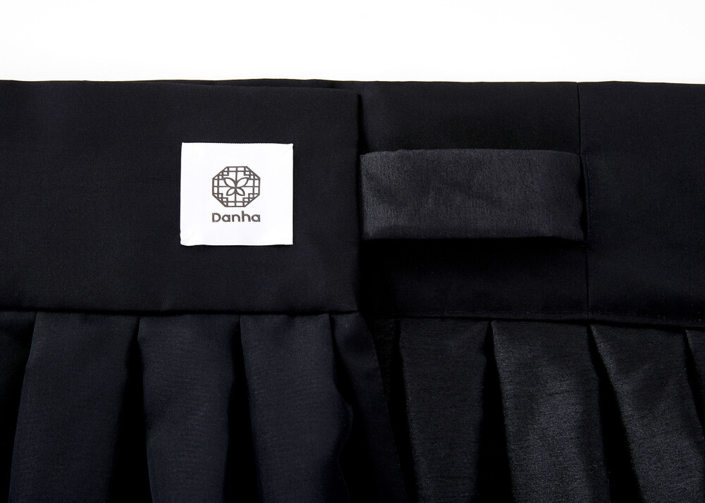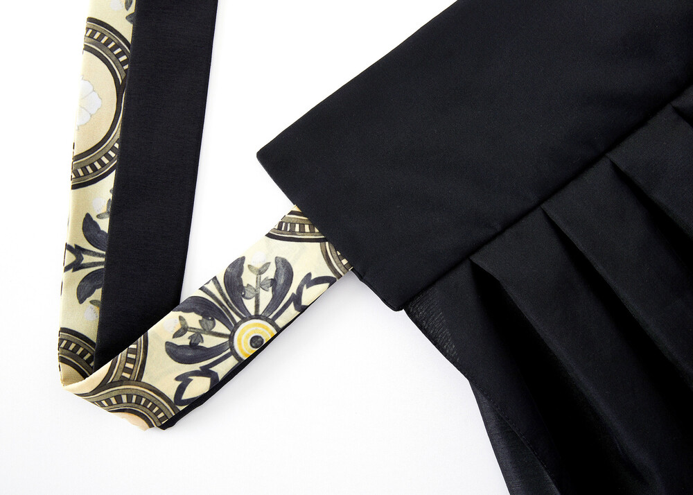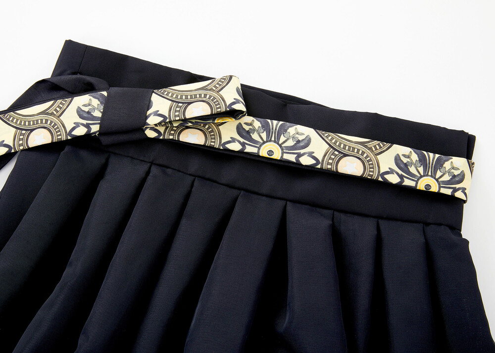 블랙 색상의 원단과 조선 궁중 도배지 문양이 어우러져 고급스러운 느낌의 허리 치마입니다.