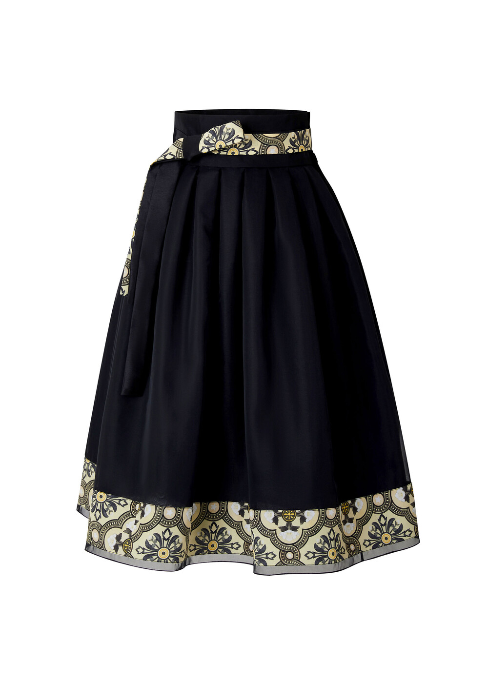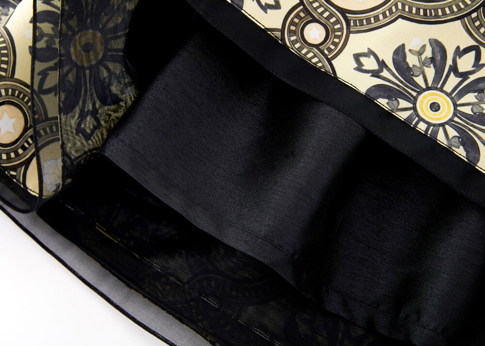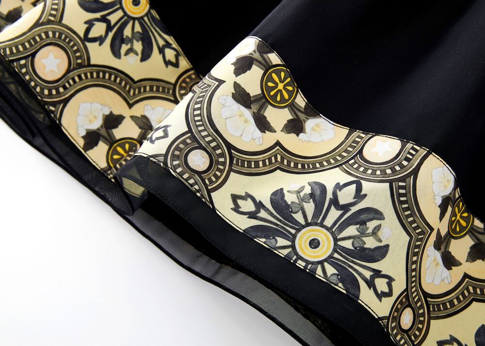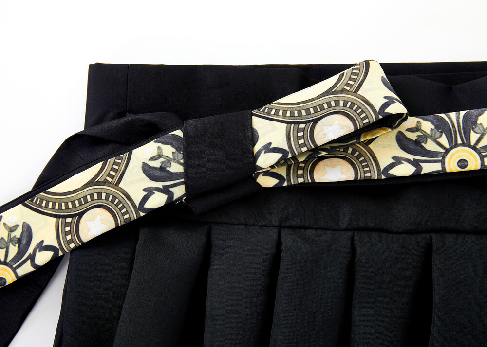 블랙 색상의 원단과 조선 궁중 도배지 문양이 어우러져 고급스러운 느낌의 허리 치마입니다.