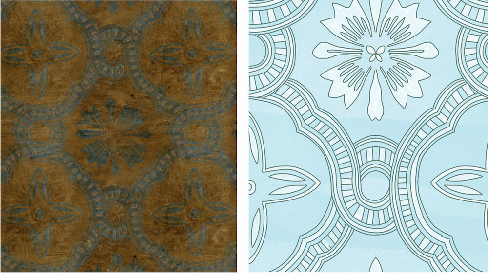 원본 도배지는 청색과 은색을 사용하여 줄 모양의 띠로 화려하게 장식되어 있다면,