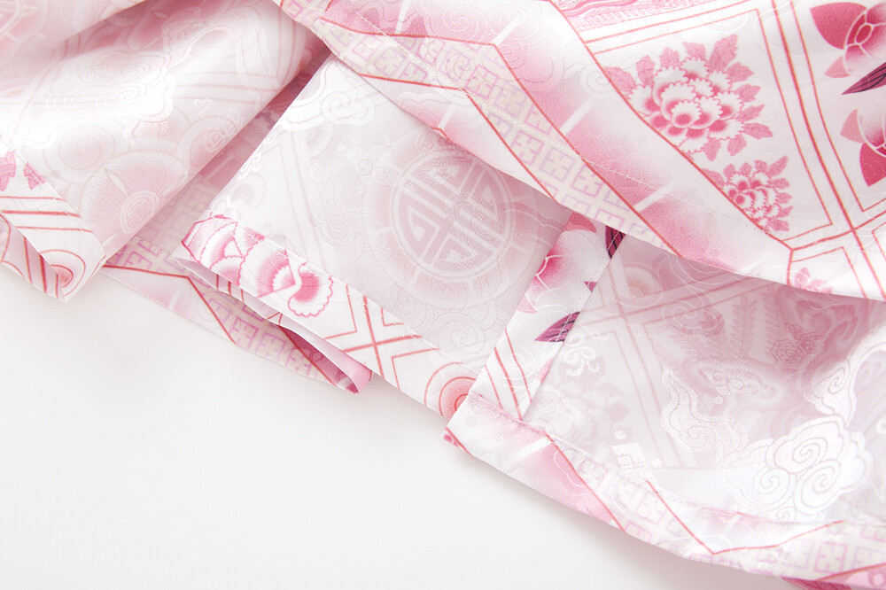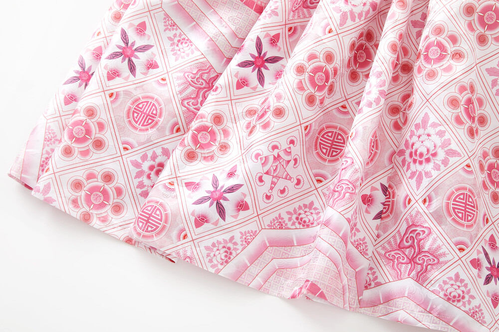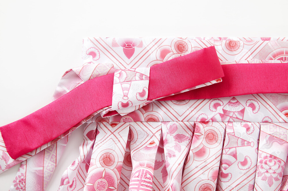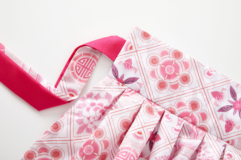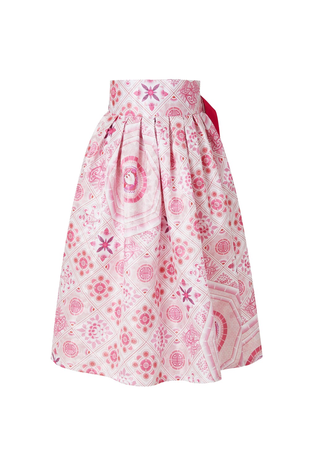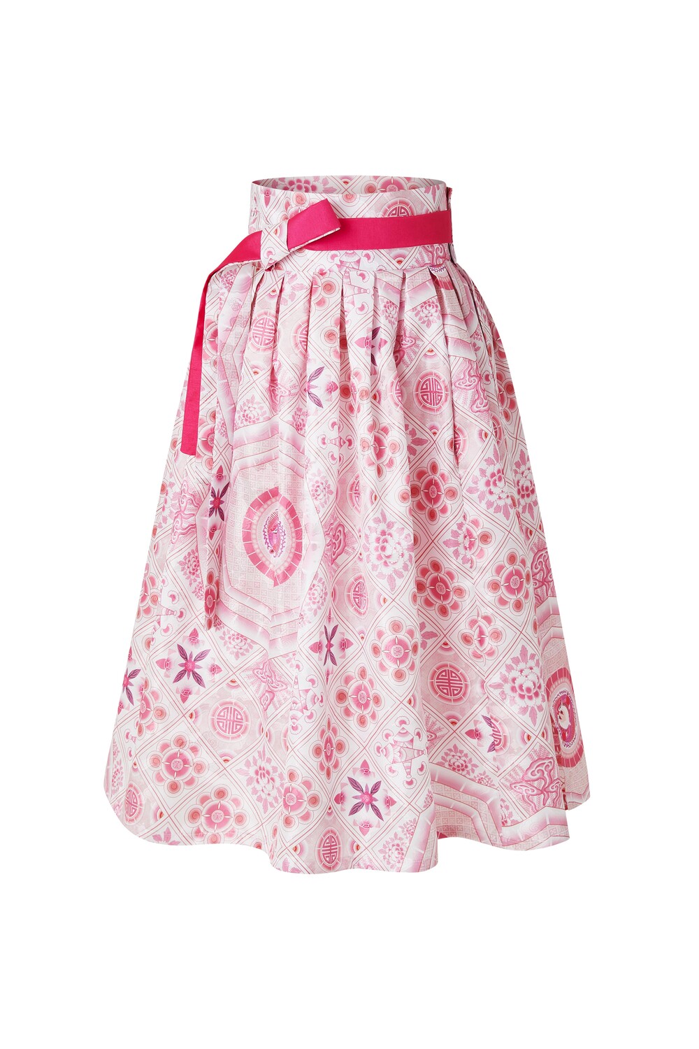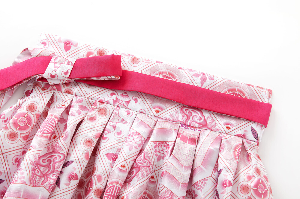 장수, 부귀, 평안, 자손번창 등을 기원하는 길상적인 의미를 담고 있는 화문 패턴으로 디자인된 허리 치마입니다. 핑크색이 포인트가 되어 귀여운 느낌을 더하며, 한국의 전통 원단인 운문단에 프린팅하여 고급스러운 광택감이 돋보입니다. 구김이 잘 가지 않는 소재로 편안함을 제공하고, 실용적인 주머니 디테일이 더해져 실용성과 스타일을 모두 갖춘 유니크한 아이템입니다.