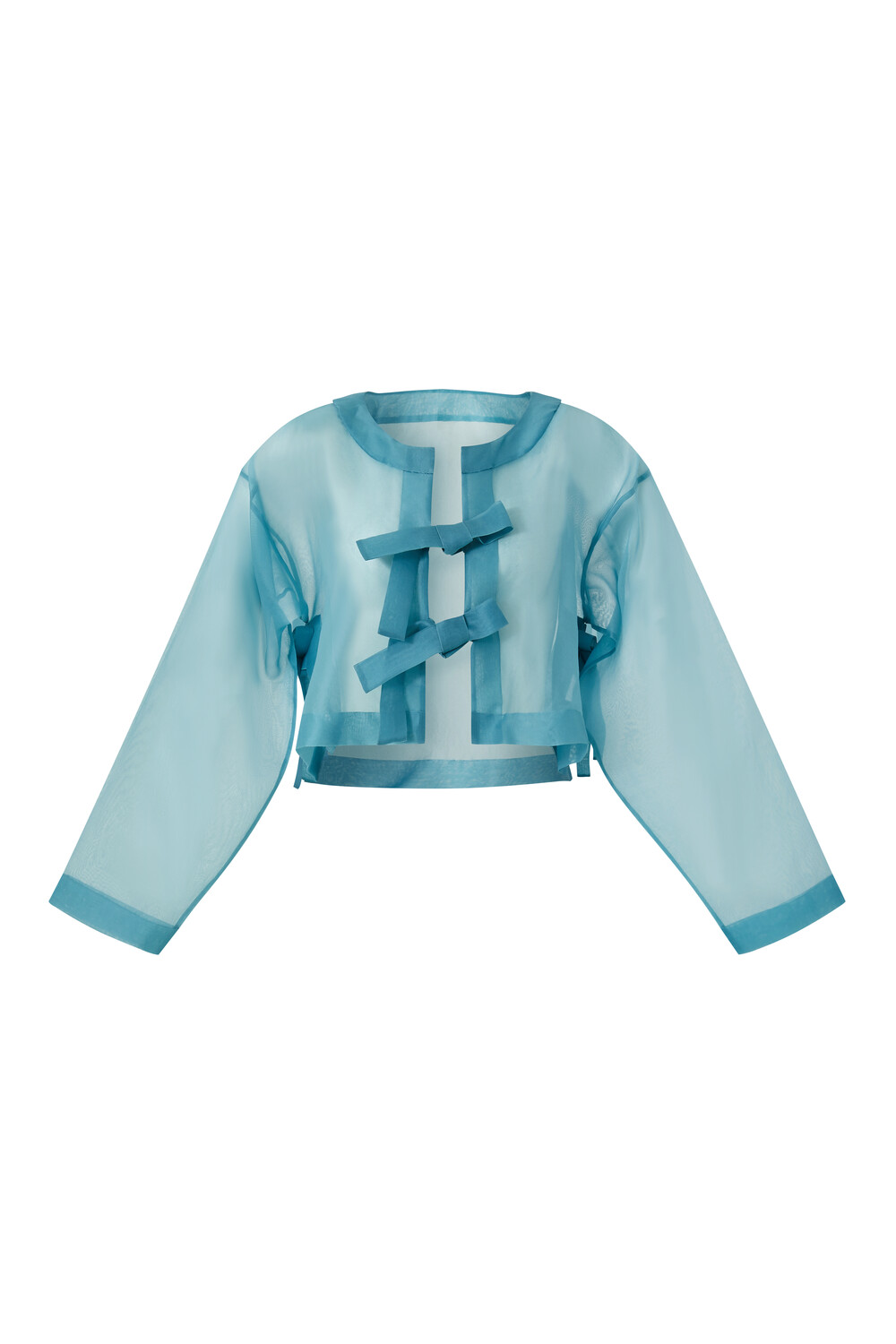 리본 시스루 저고리 자켓은 프론트와 사이드의 리본 여밈 디테일이 돋보이는 독특한 아이템입니다.